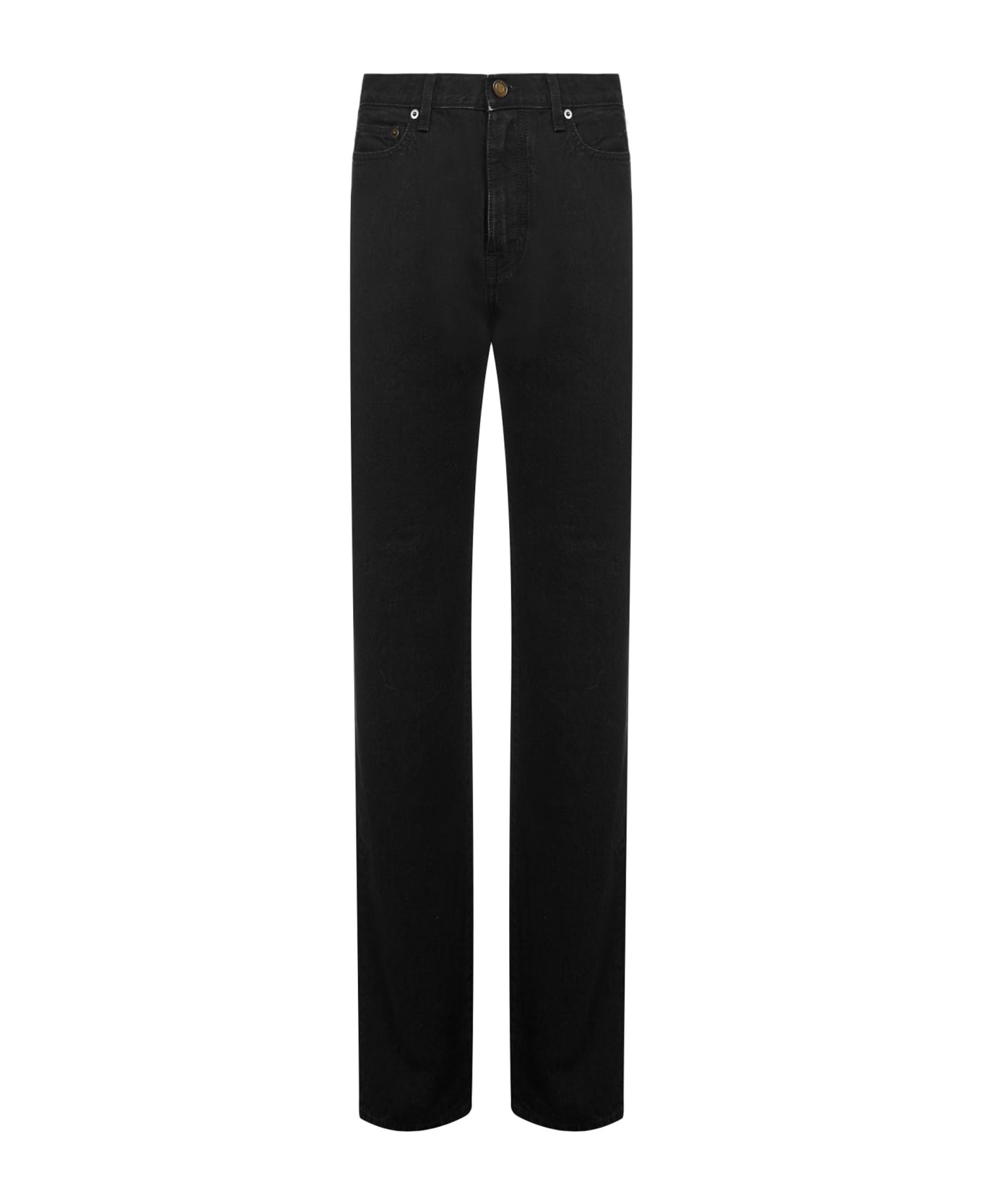 Let yourself be guided by the 90s vibes of Saint Laurent jeans. Designed with the straight leg cut, high waist and classic five pockets, they are made of black cotton denim. The tone-on-tone leather label applied on the back is the discreet and sophisticated detail that completes the garment.