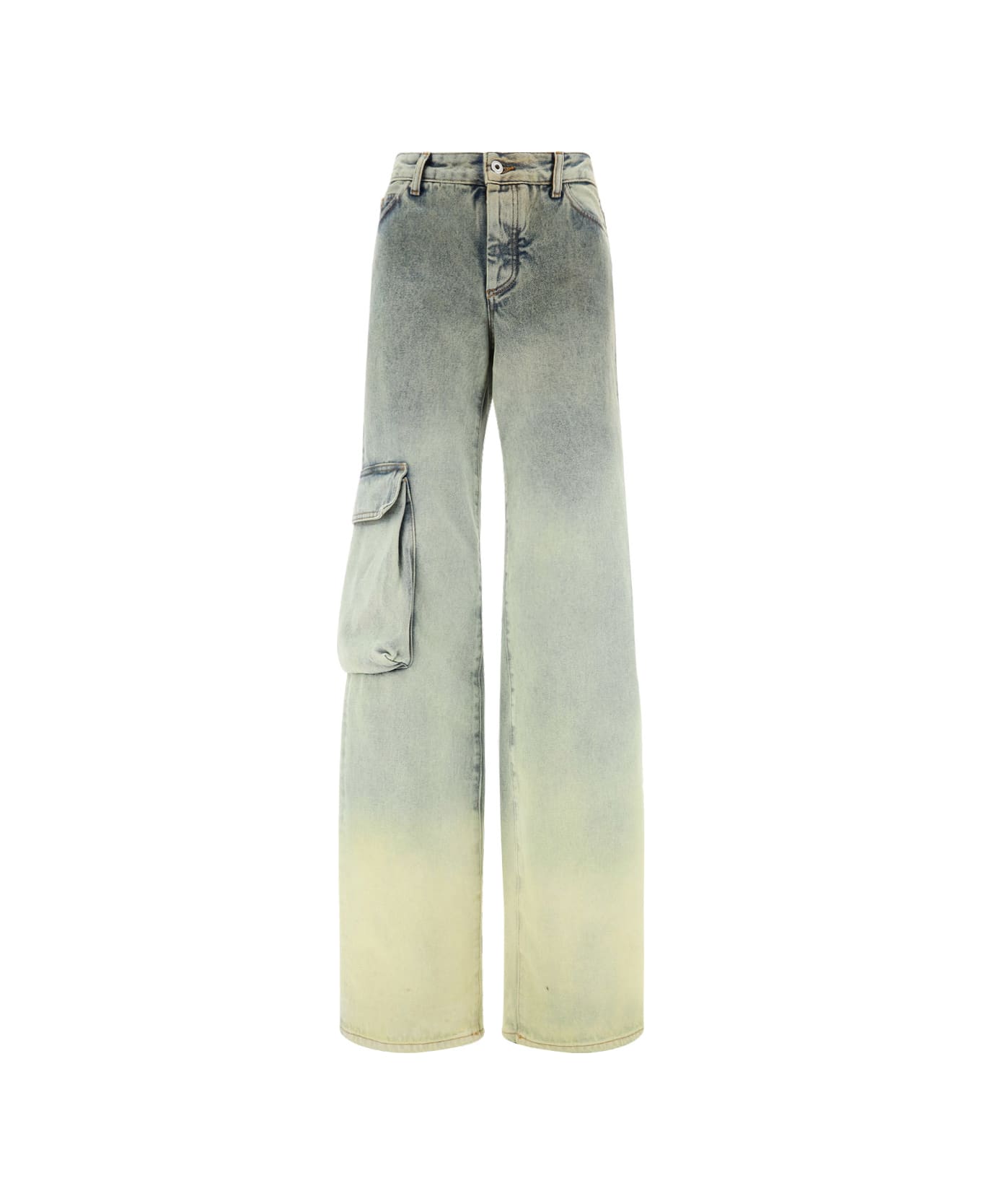 Cotton toybox jeans by off white, five-pocket straight style, front button closure, front button closure, waistband loops, iconic leather patch with brand signature pressure-printed applique on back, patch cargo pocket on side panel, washed-out denim pattern.