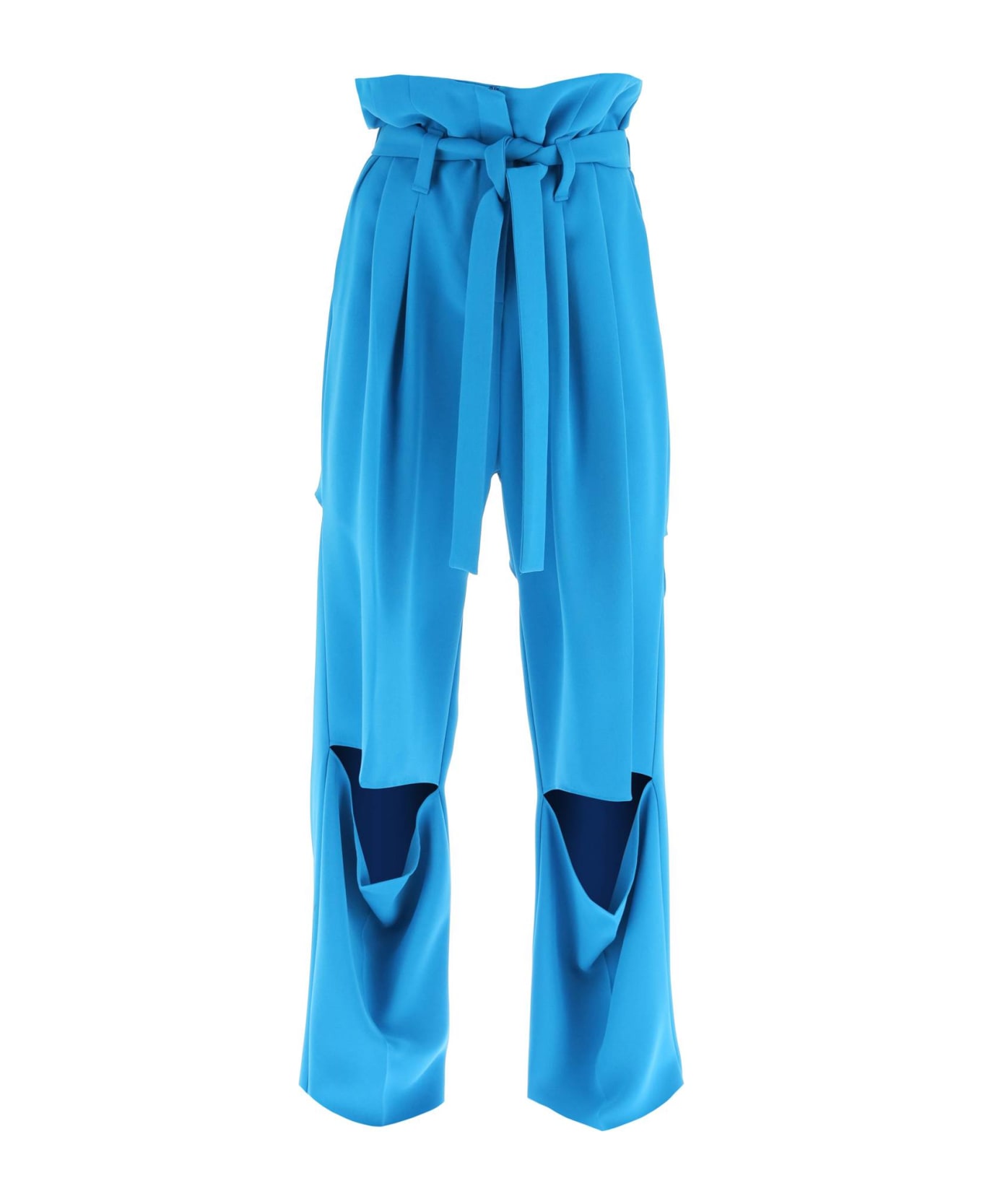 High-waisted A. w. a. k. e. Mode pants made of lightweight crepe, featuring a wide-leg design with relaxed fit, finished with horizontal cut outs on the front and back of the leg. Matching self-tie belt, invisible zipper closure at the front. The model is 177 cm tall and wears a size FR 36.