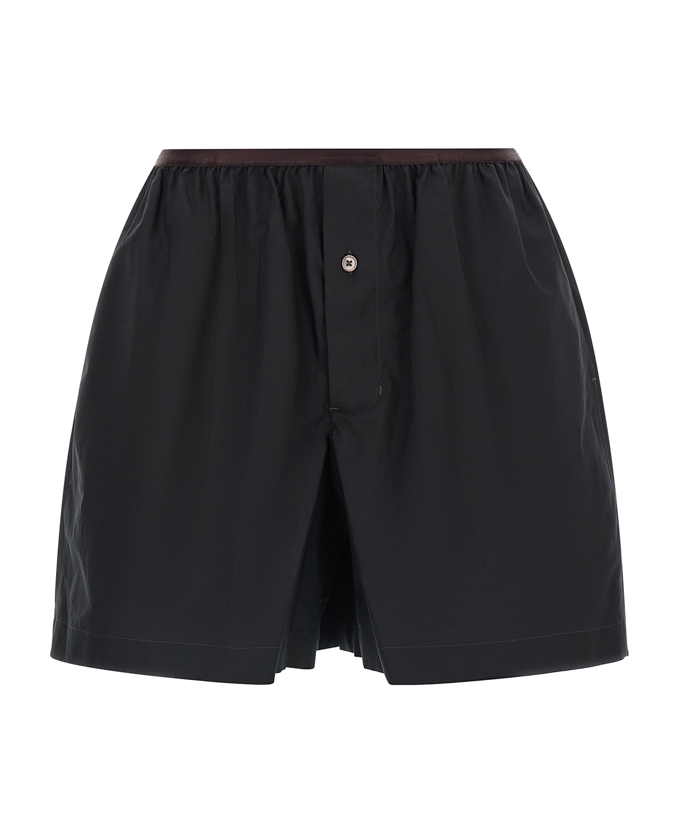 'Boxer' lightweight cotton shorts with slightly curled contrast elastic waistband, front buttons, very wide leg and side pockets.