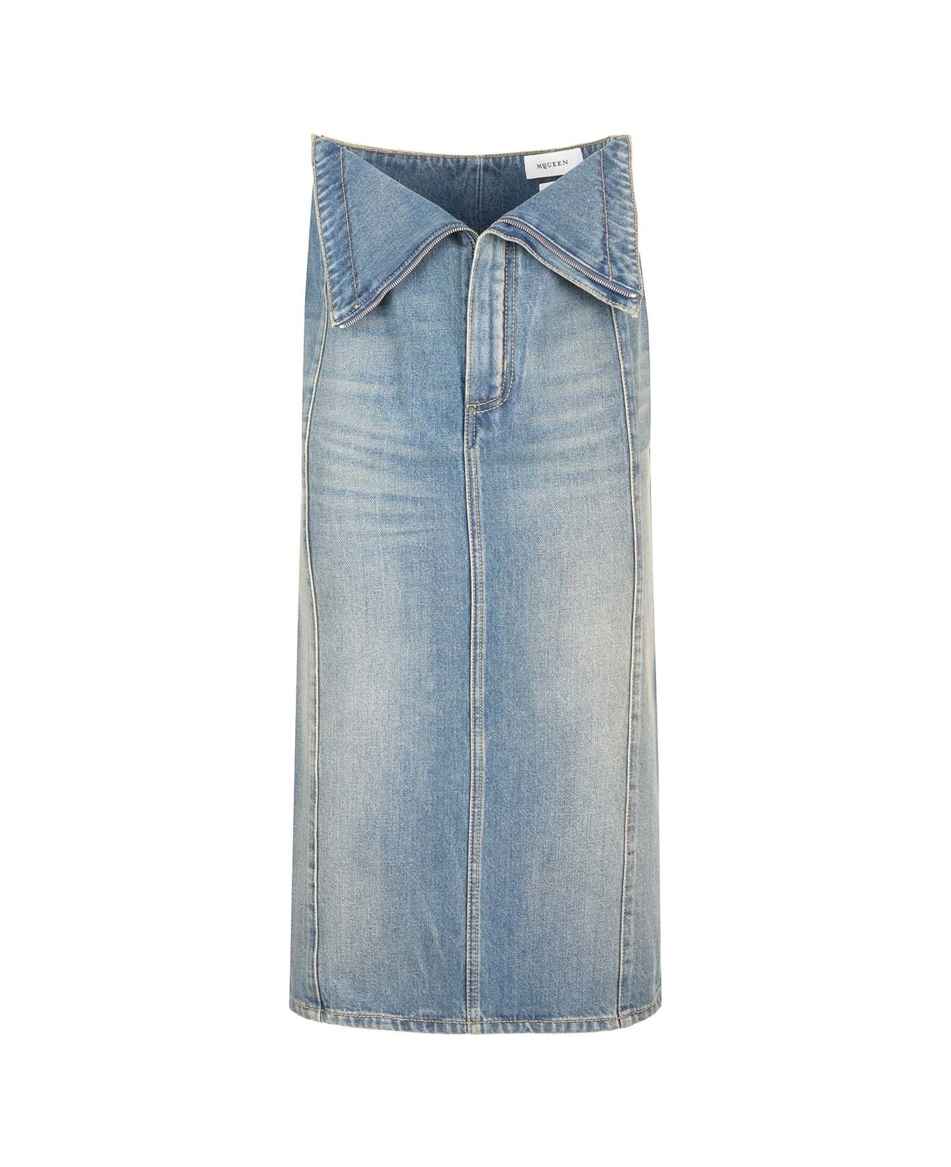 Faded indigo denim midi skirt from Alexander McQueen, featuring an high waist with turn-up and zip fastening. Composition: COTTON
