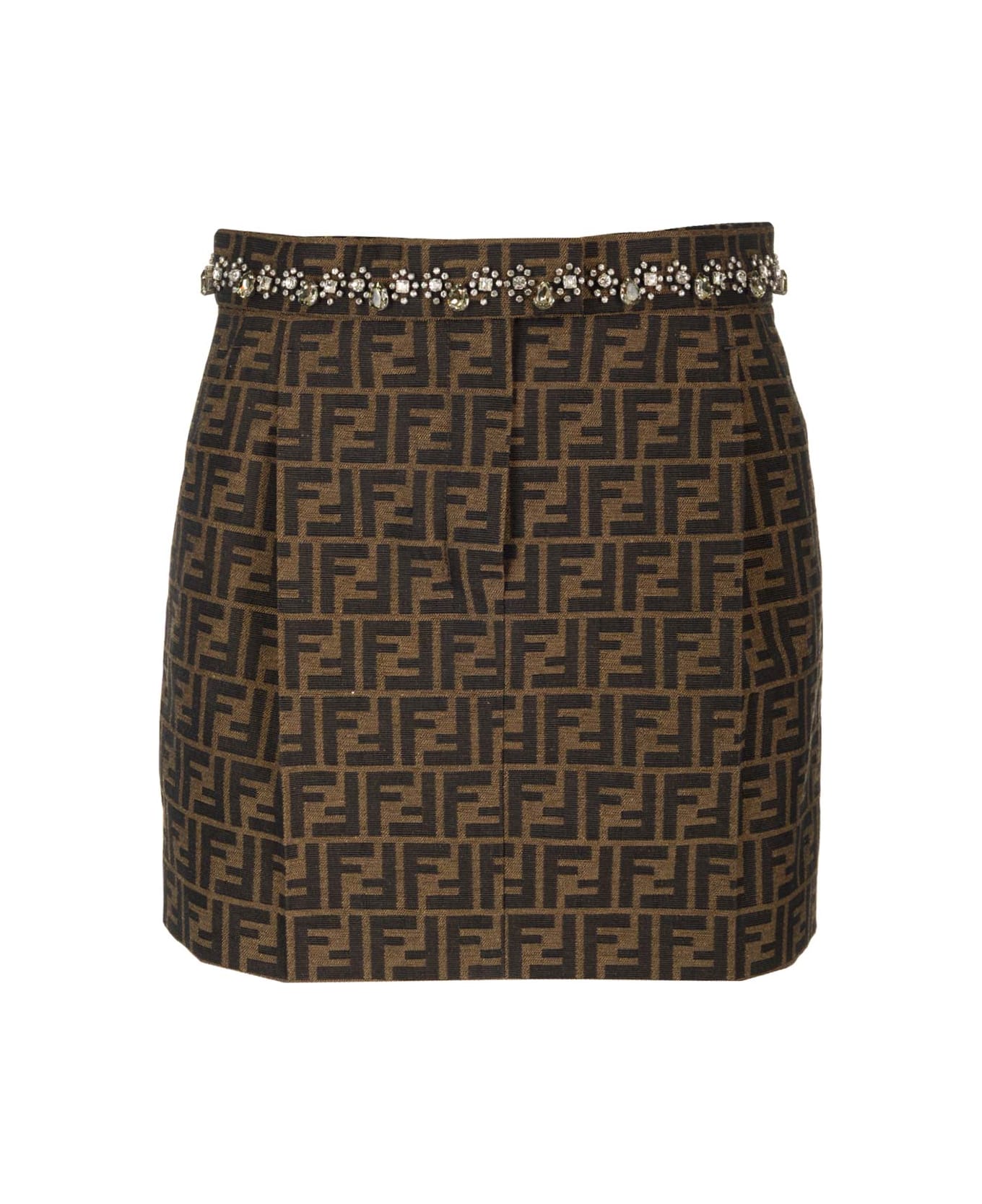 Mini skirt with front pleats from Fendi, crafted from brown canvas with all-over jacquard FF motif, hidden zip closure, crystals embroidered waist. Composition: 65%PL,35%CO+FOD. :100%VI