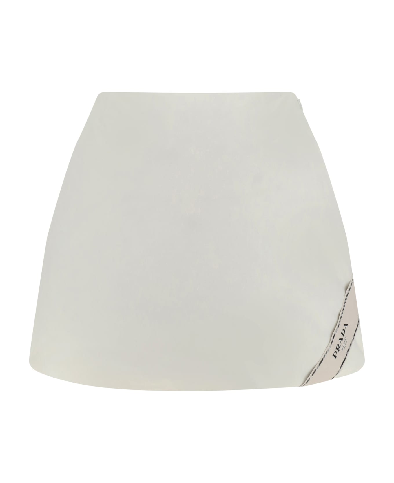 Cotton miniskirt by prada, side closure by invisible zipper, iconic brand signature patch embroidered on hem, iconic brand logo triangle embroidered tone on tone on back. Composition: 100% % Cotton