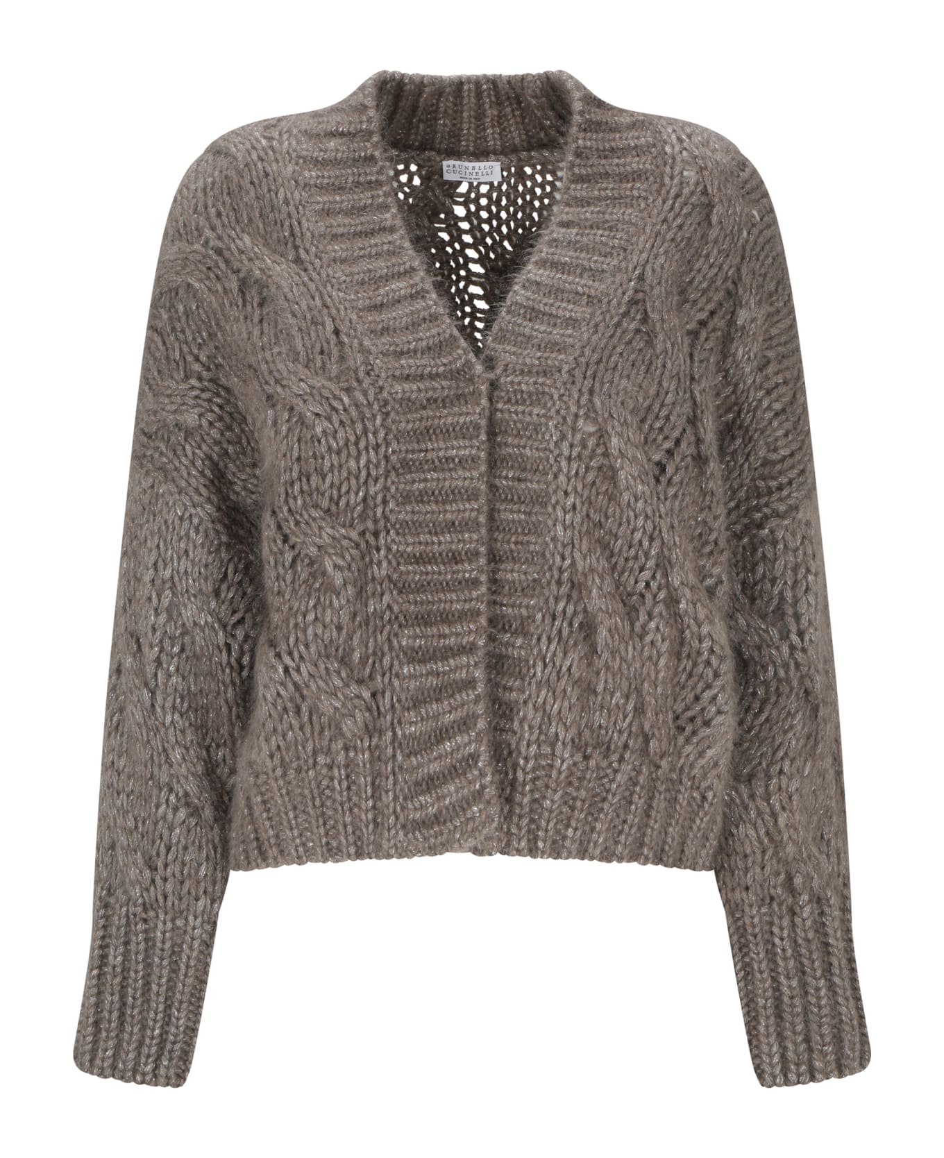 Mohair cardigan by brunello cucinelli, a ribbed front v-neck, a front closure with an inside button, ribbed cuffs, a monochrome mélange pattern, a ribbed hem, a knit design, and a regular fit.