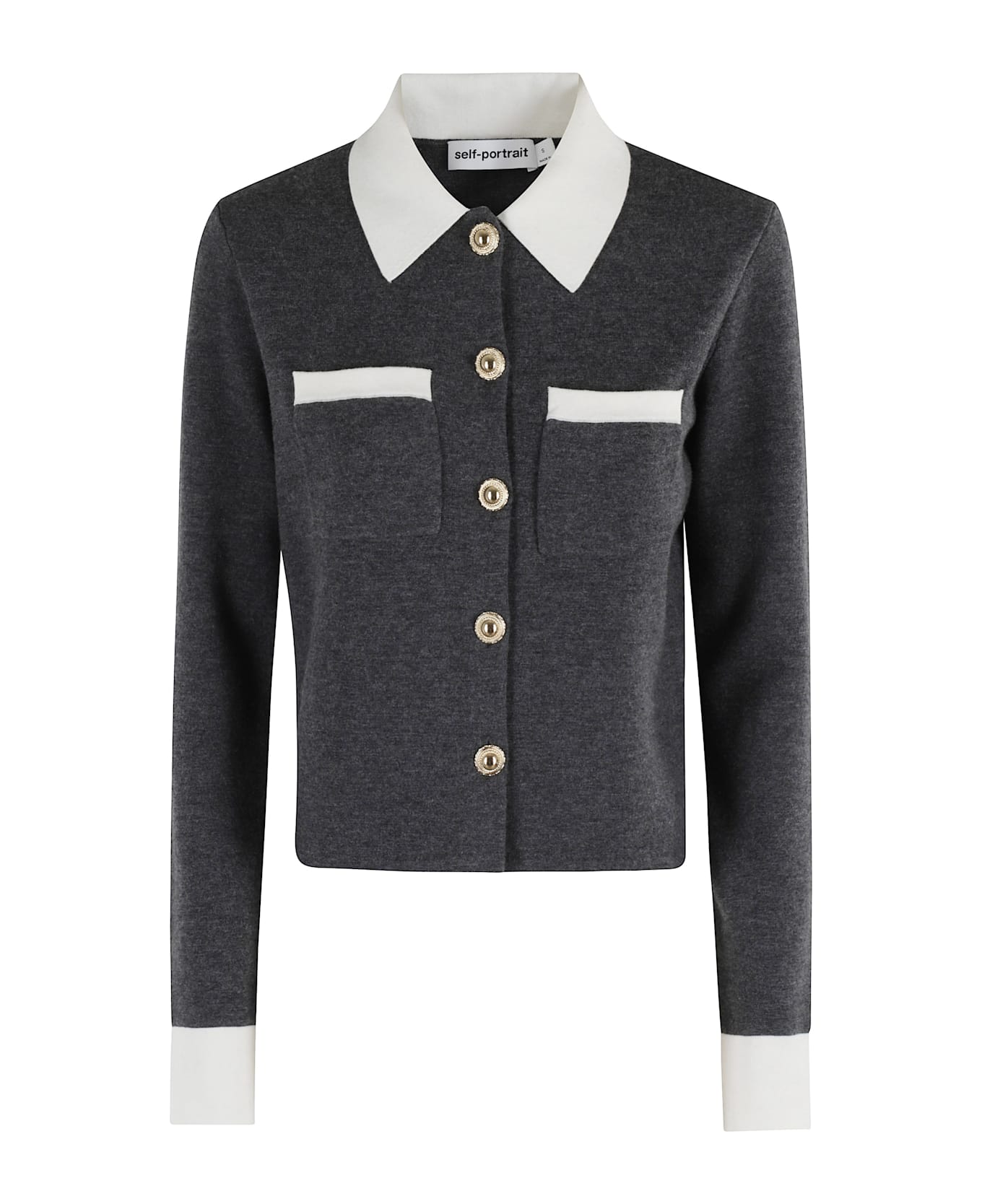 Sweater - Self-Portrait - Gray and white color - Cardigan pattern - Contrasting white polo collar - Double front pocket with contrasting white border - Long sleeves with contrasting white bottom - Gold button front closure