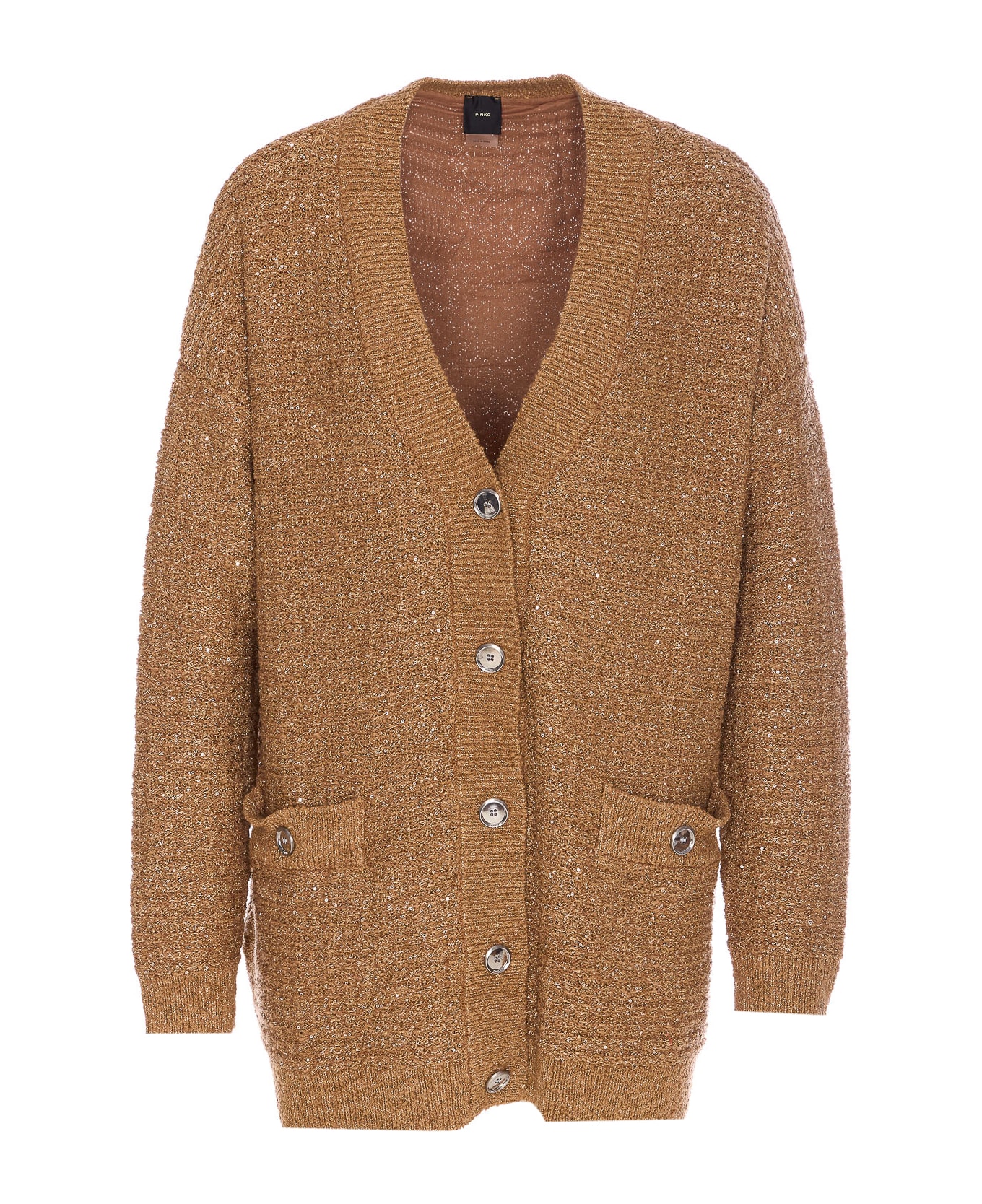 Pinko beige Mezzo cardigan with frontal buttons closure, V-neck, long sleeves, all over sequins details, pockets with button closure