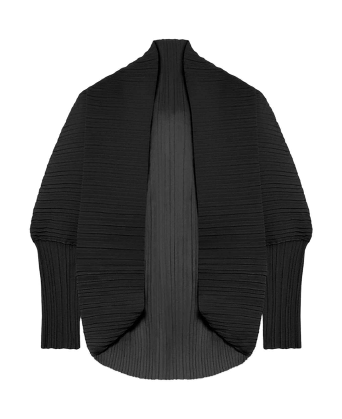 Shrug in pleated fabric characterized by a particular gathered texture that gives volume and structure to the garment Model with shawl collar and long kimono sleeves. Composition: 100% Fabric