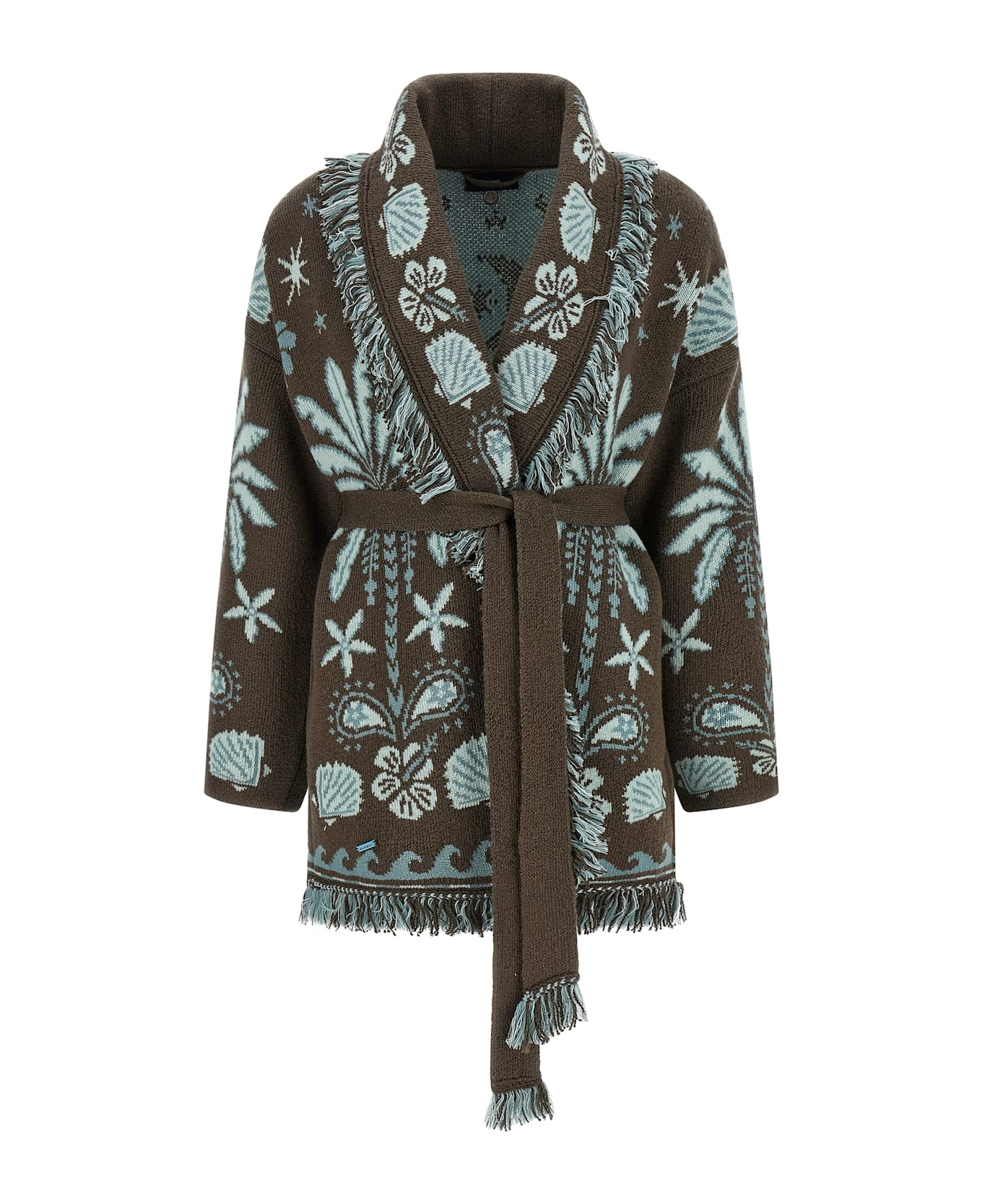 Double 'Echoes Of The Island' cotton and wool blend knit cardigan with textured scarf, 'Icon' fit, dressing gown style with shawl neckline and frayed edges, long sleeves, pockets, removable belt. Composition: 60% wool, 40% cotton
