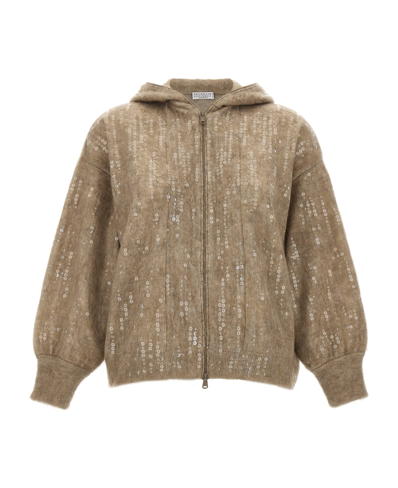 Hooded cardigan in mohair blend with all-over sequins, zip closure, pockets, and long sleeves with cuffs. Composition: 28% wm 26% wv 20% pa 13% ws 8% wo 5% se
