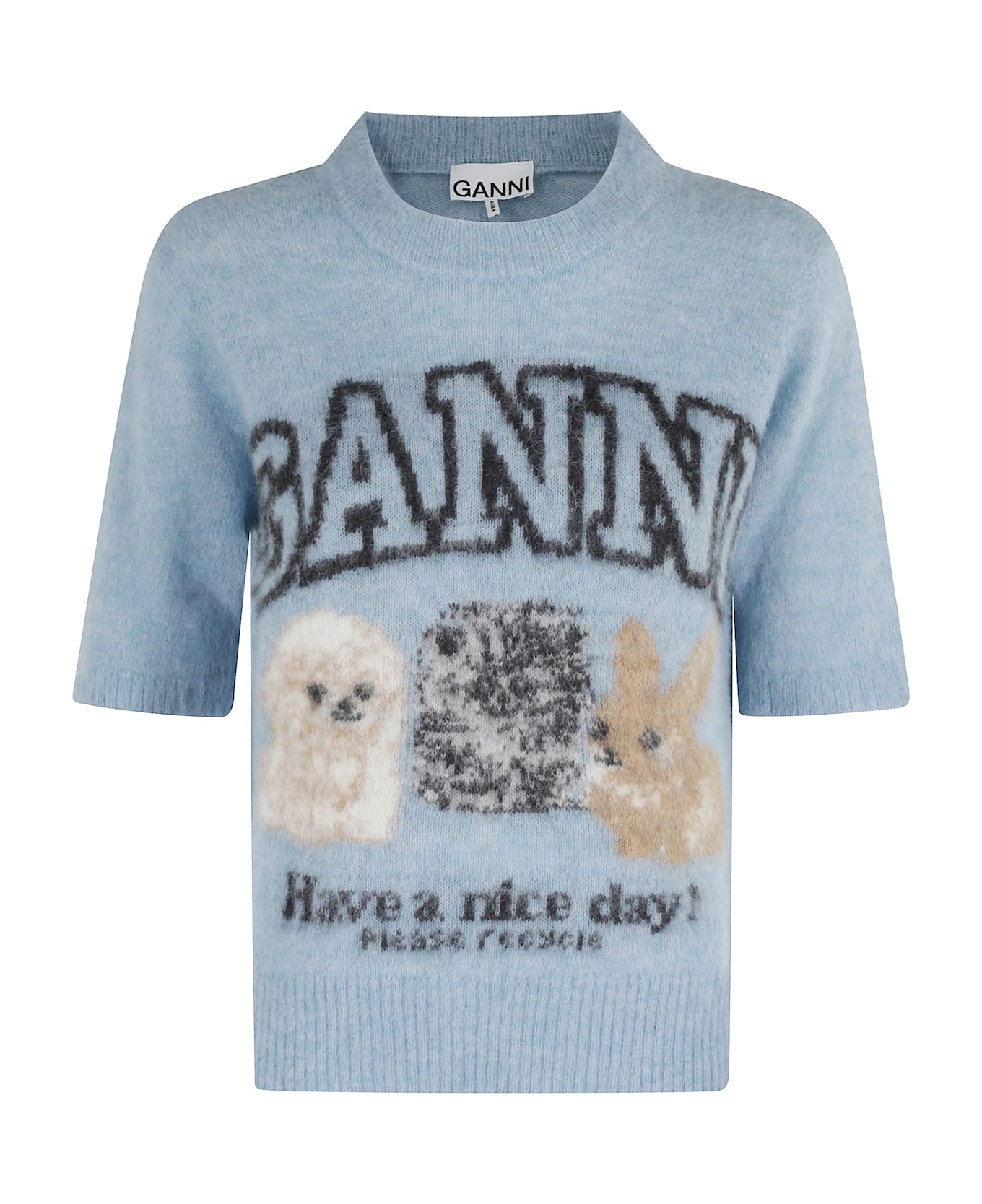 Alpaca Puppies Sweater - Ganni - light blue color - alpaca knitting - crew neck - half sleeves - front design - ribbed trim - regular fit