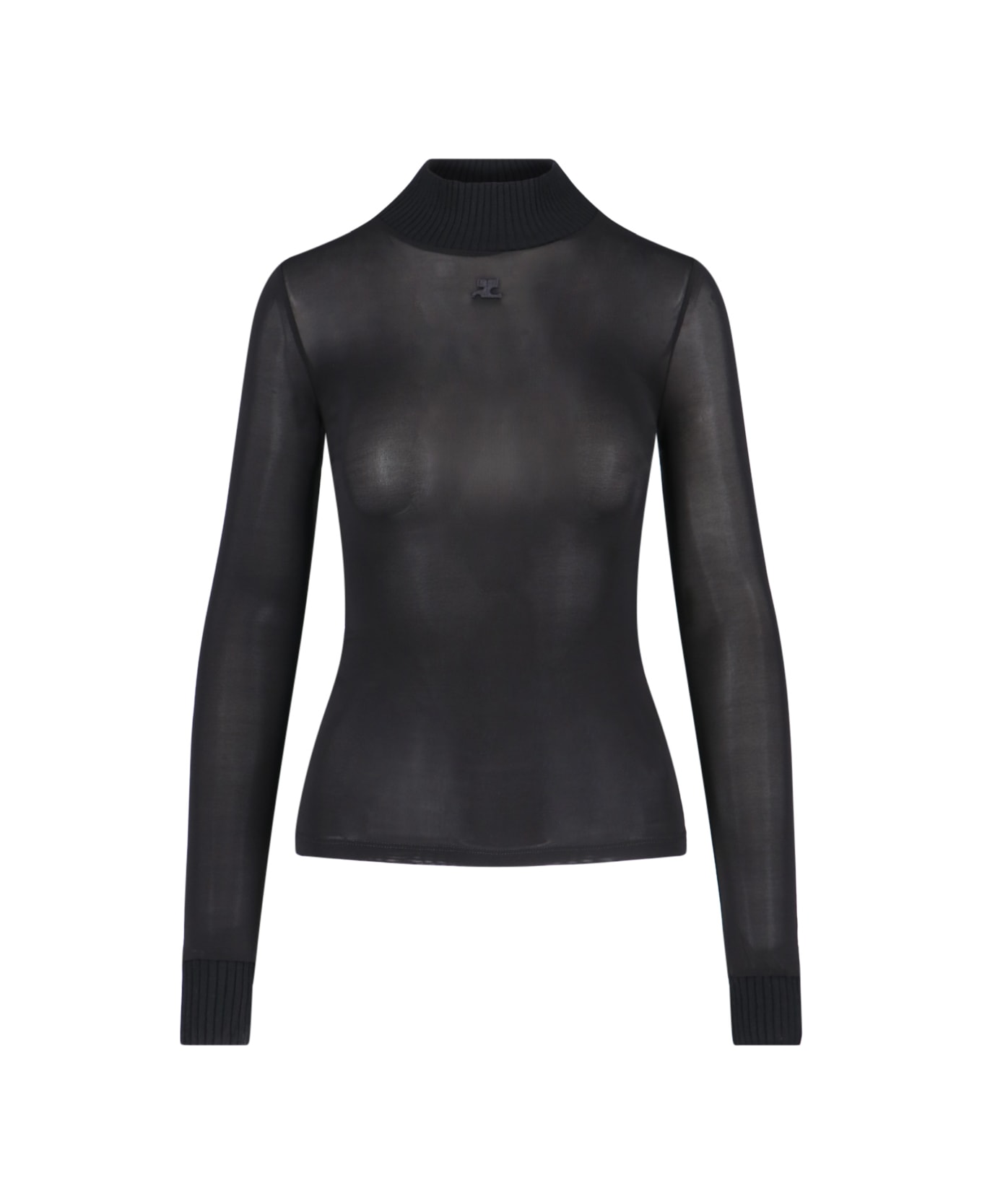 Courrèges logo sweater in black stretch viscose with ribbed pattern, high neck, tone-on-tone logo patch on the front, straight hem. Composition: 95% Viscose, 5% Elastane