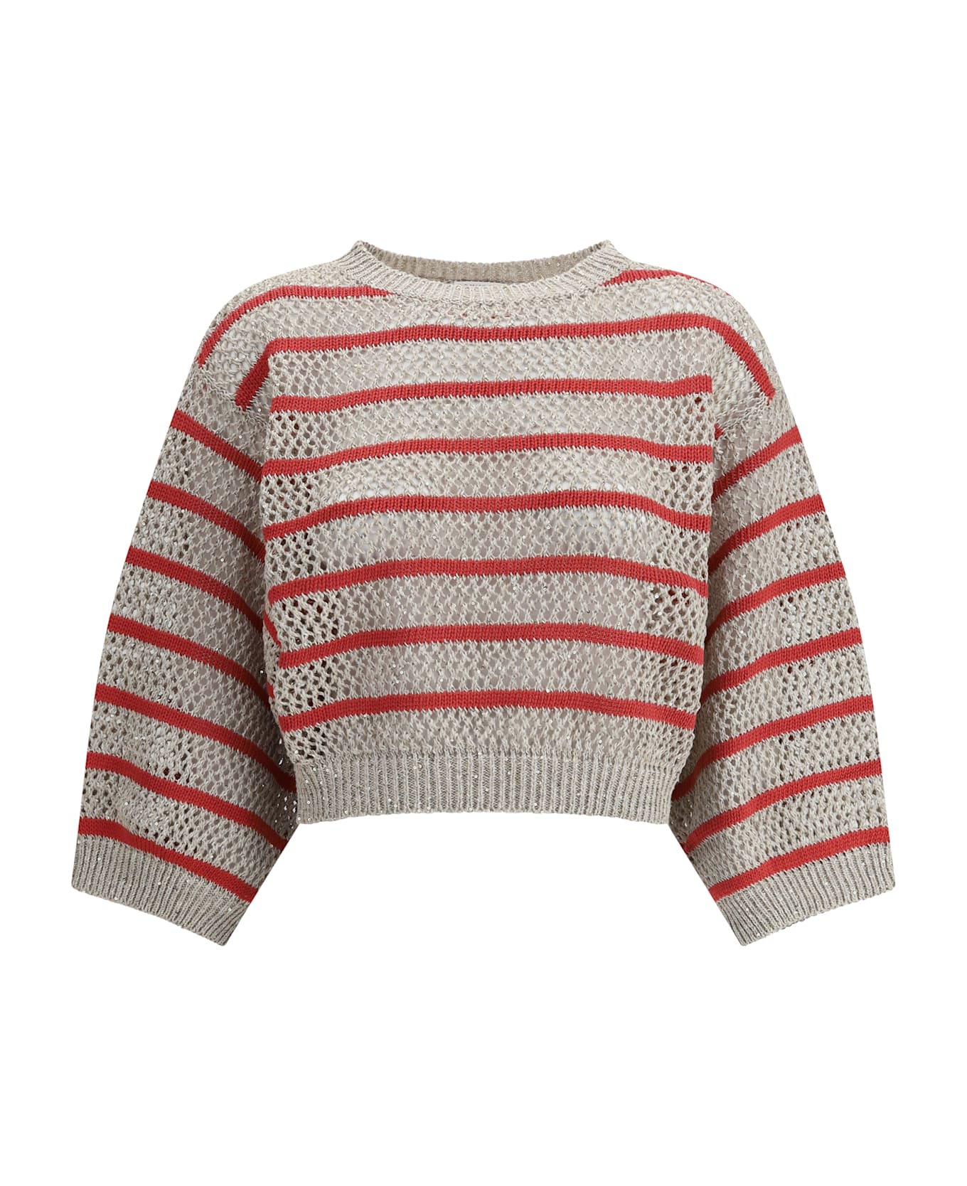 The linen sweater by brunello cucinelli is an elegant and sophisticated piece, featuring a ribbed crew neck that adds a touch of refined simplicity. the openwork knit design with all-over shiny sequin details adds brightness and a touch of glamour. the wide three-quarter sleeves create a soft and fluid effect, while the ribbed cuffs and hem ensure a comfortable and well-defined fit. the loose fit gives the sweater a relaxed yet elegant look, making it ideal for sophisticated yet comfortable looks.