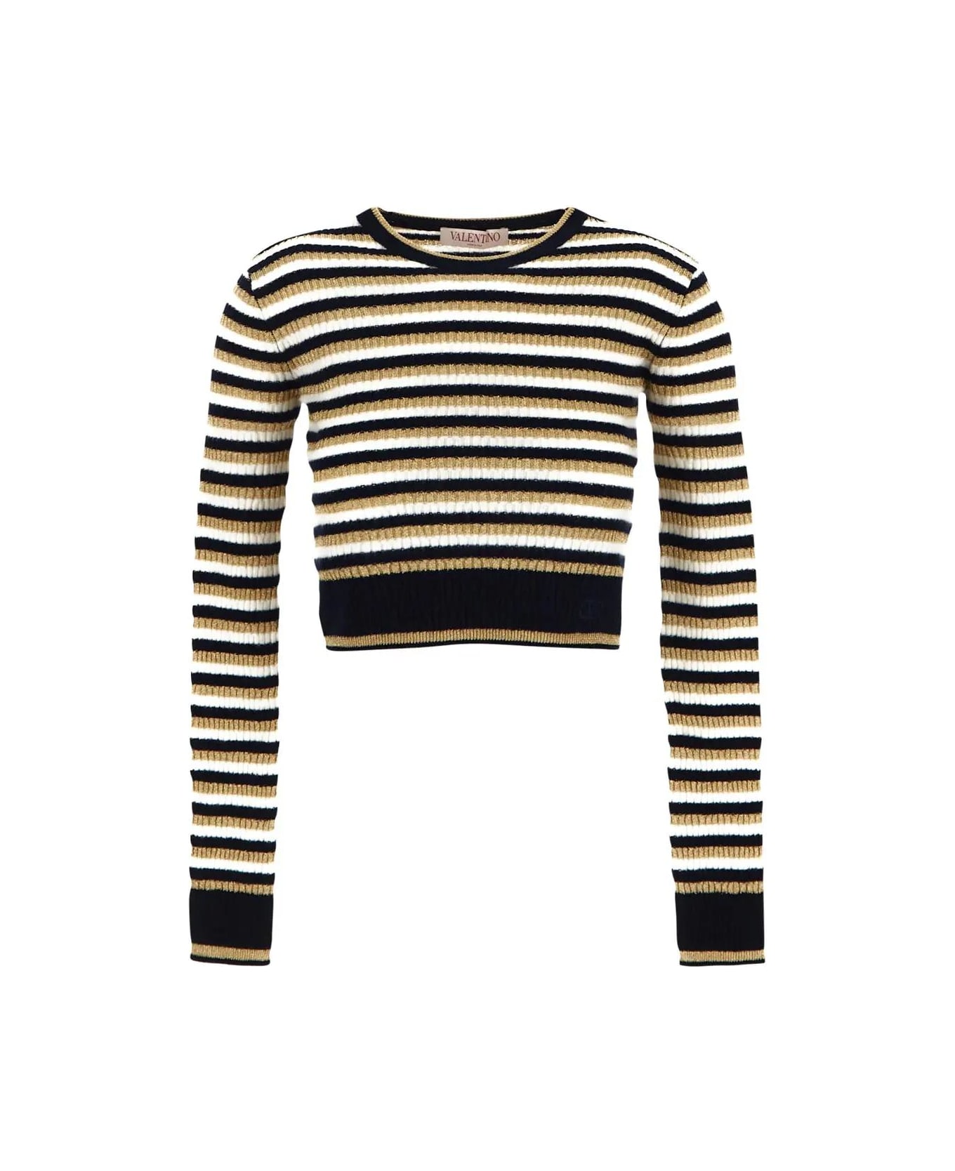 Valentino cropped jumper in wool/lurex blend with ivory/navy/gold stripes motif, a round neck, long sleeves, tight fit and a tonal logo embroidery at the bottom. Composition: 49% Wool, 29% Viscose, 13% Metallic Fibre, 9% Polyamide