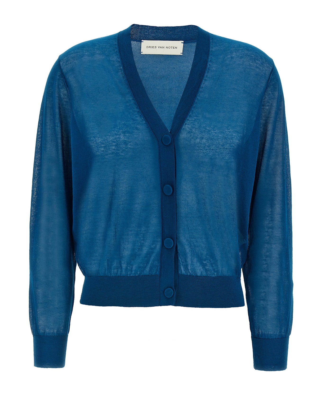 'Talita' cardigan in semi-transparent cotton blend with V-neck, front button closure, long cuffed sleeves.