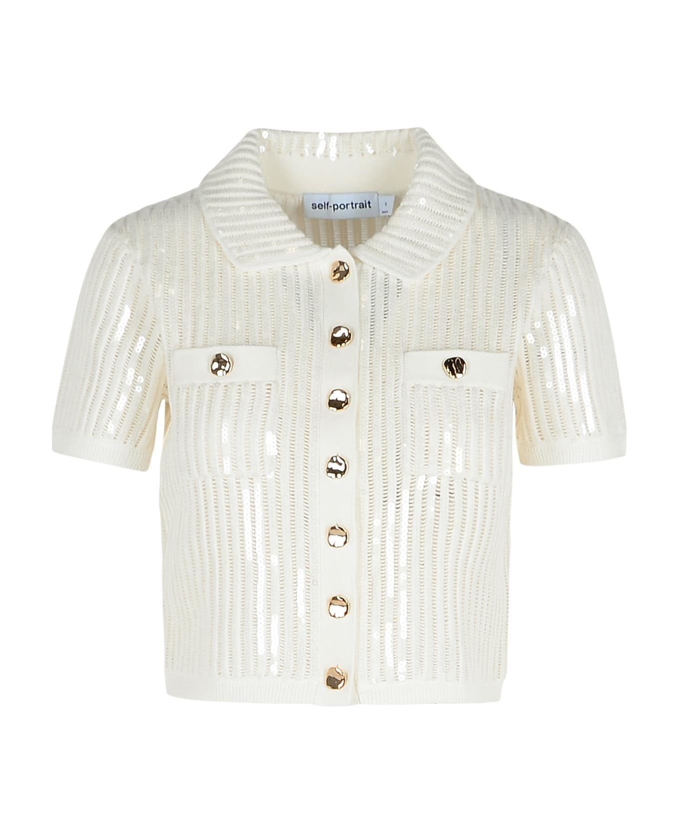 Knitted texture, two front pockets, tone-on-tone sequins, ornamental buttons Composition: 96% cotton, 4% cashmere