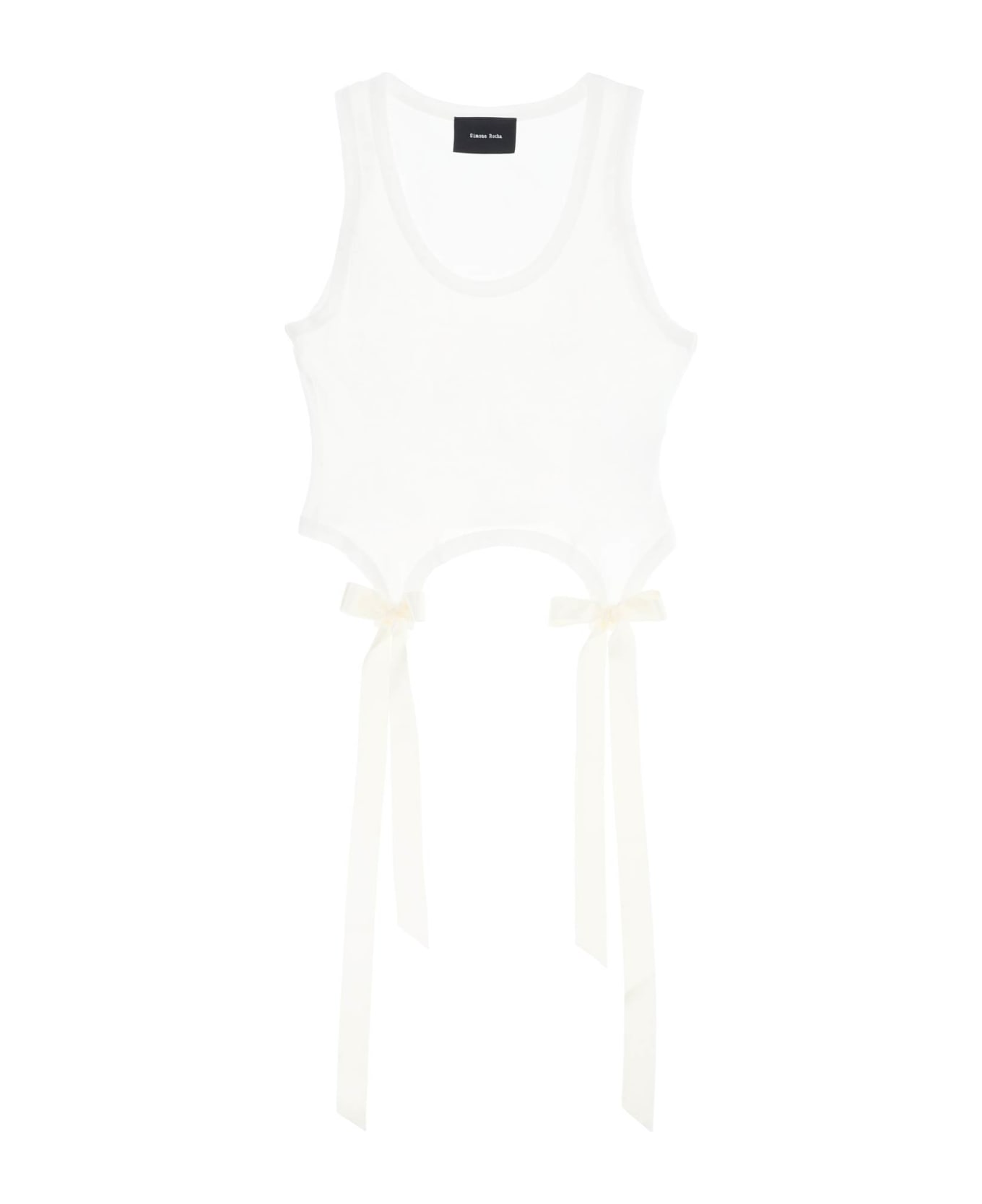 Cropped tank top by Simone Rocha crafted in soft cotton jersey, characterized by asymmetric front hem embellished with tonal satin bow tails. Scoop neck, slim fit. The model is 177 cm tall and wears size XS.