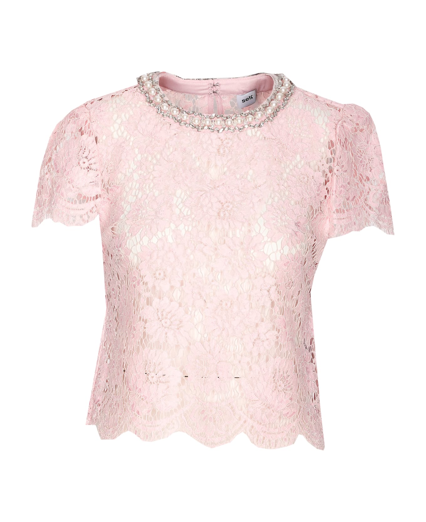 Self Portrait pink lace top, zip and hook closure, crewneck, application pearls and crystals details, short sleeves Composition: 63% Polyamide, 27% Cotton, 10% Viscose