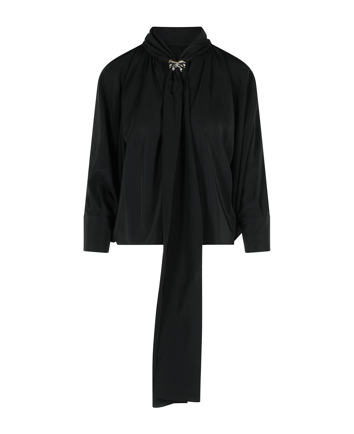 Pure silk crepe de Chine blouse, V-neck and scarf collar to tie in a bow, high cuffs with covered side button, cut pattern in the center at the back, metal jewel loop, removable, asymmetrical hem at the back Composition: 100% silk