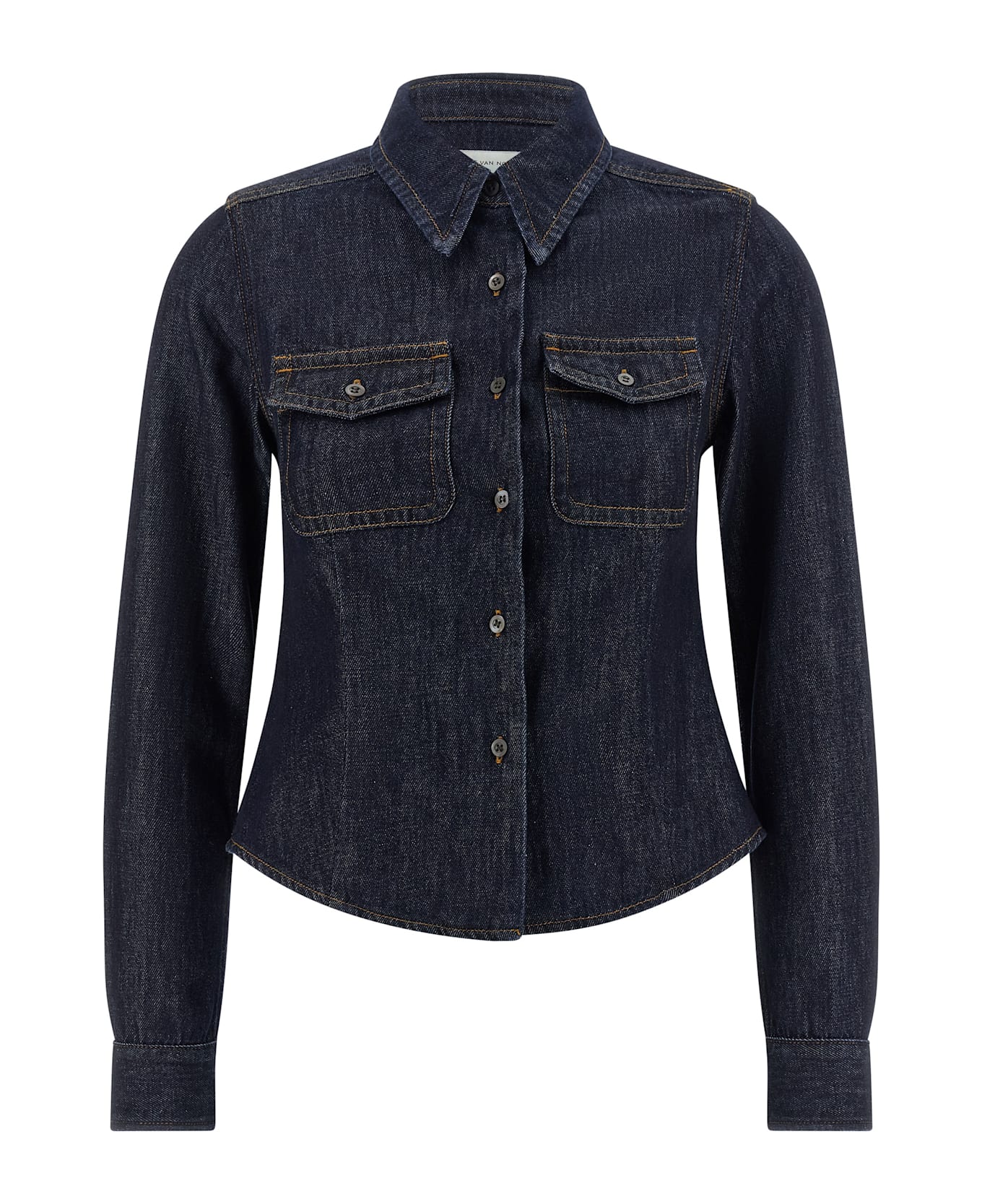'Cellie Den' cotton denim shirt with contrast stitching, slightly cropped style, front pockets, front button closure, long cuffed sleeves.