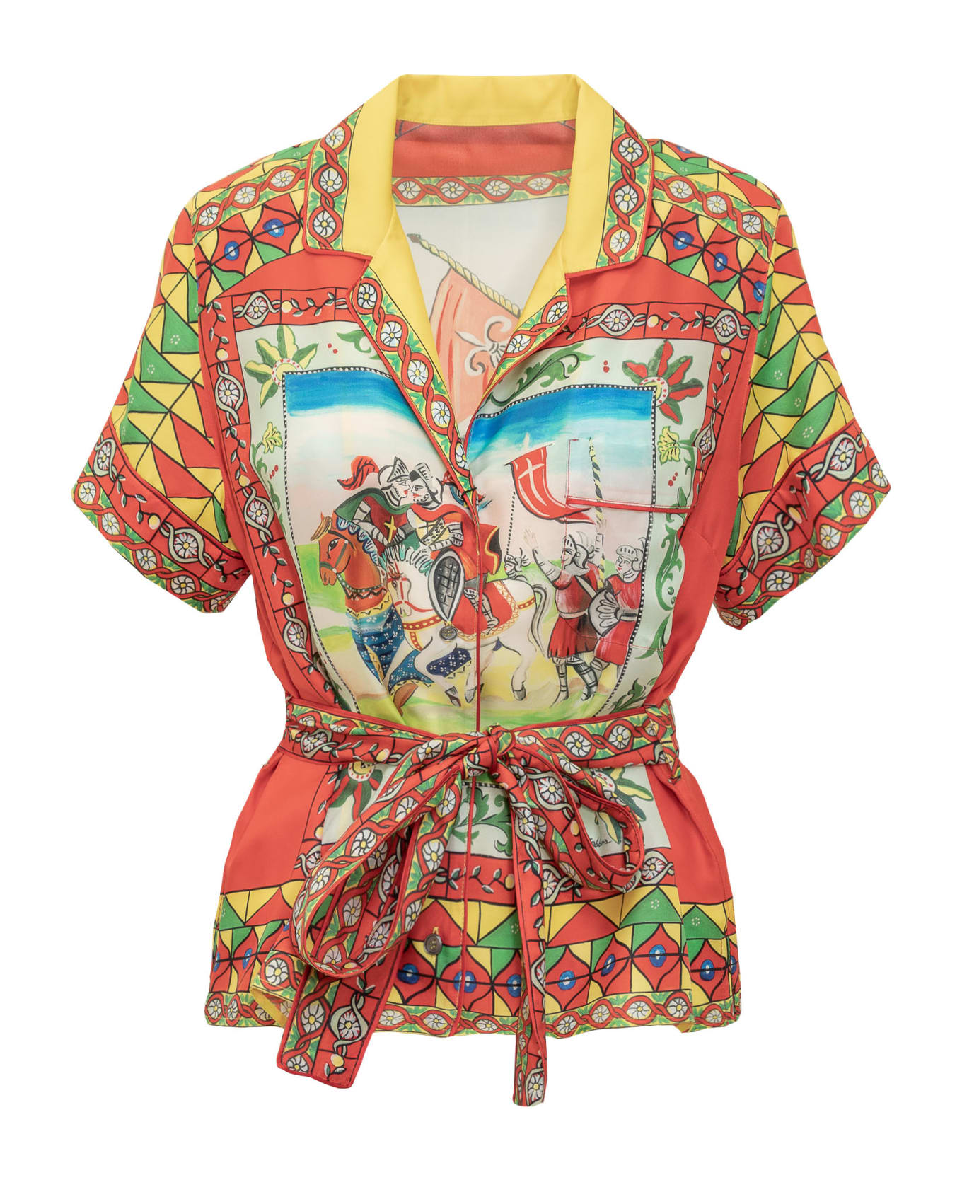 Short sleeve shirt. Button closure. Chest pocket. Cuban collar. Waist belt. All over print. Composition: 100% Silk