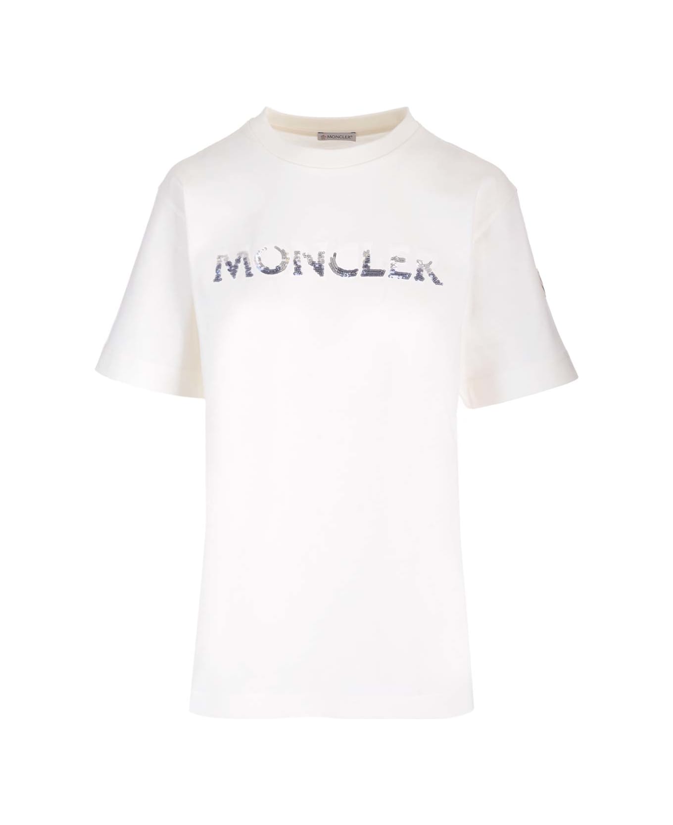 White jersey T-shirt with silver sequins logo from Moncler. Composition: Ext. Composition:BASE FABRIC: 100%COTTON Int. Composition:BASE FABRIC: 100%COTTON