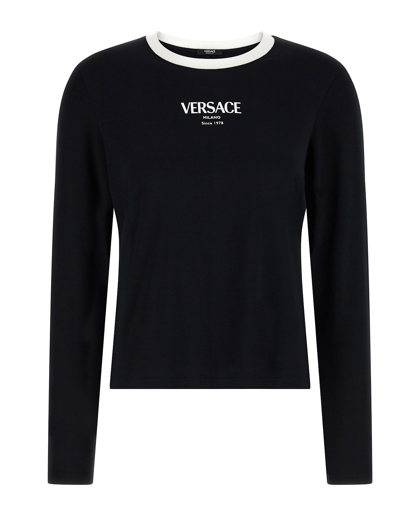 Stretch viscose jersey T-shirt with front 'Versace Logo' print, contrast crew neck, long sleeves. SUSTAINABLE: product made from sustainable materials. Composition: 95% viscose, 5% elastane