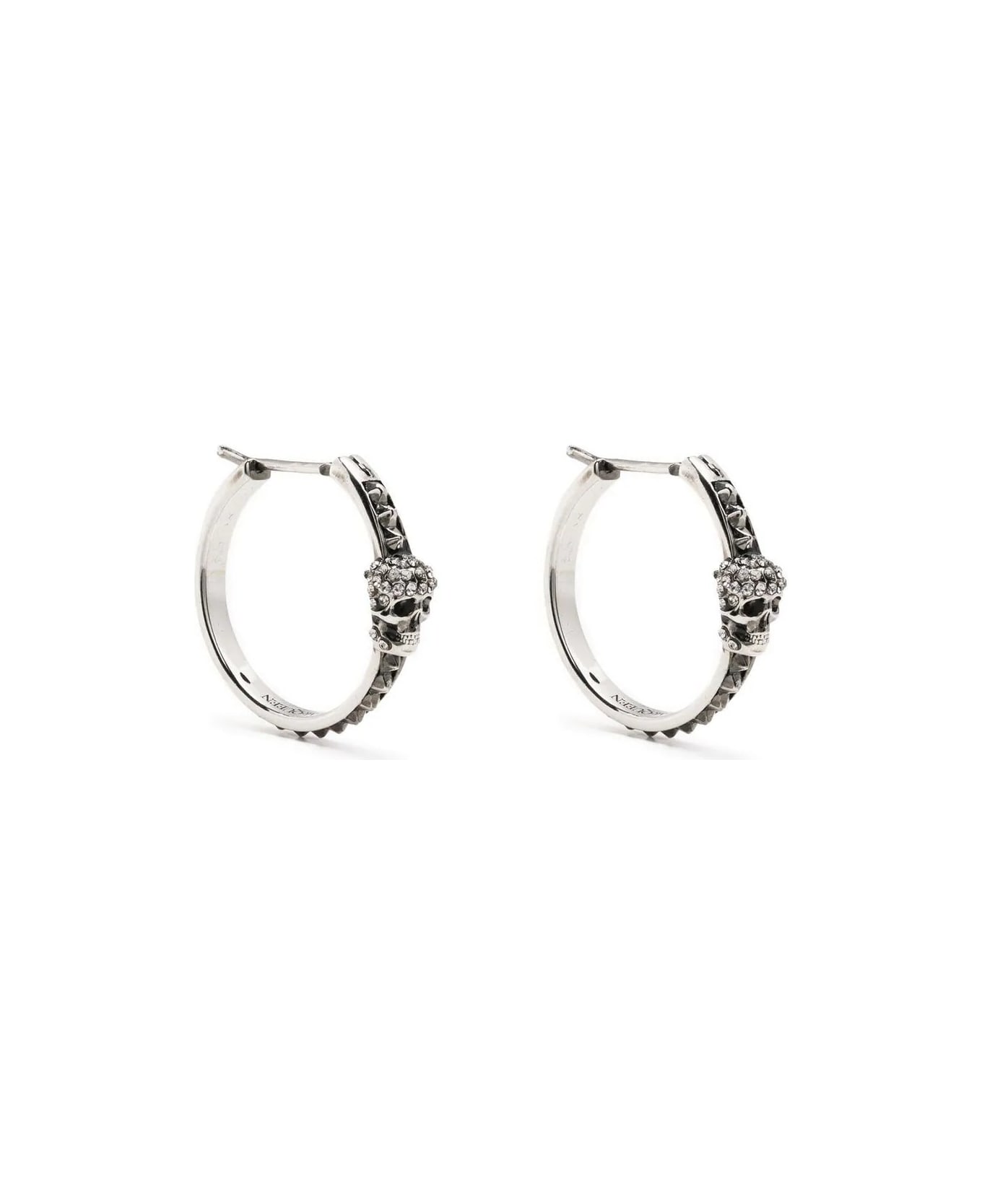 Alexander McQueen hoop earrings for woman made of brass with a silver finish and finished with micro studs and with the iconic Skull embellished with bright crystals. Suitable for pierced ears. Composition: 100% Brass