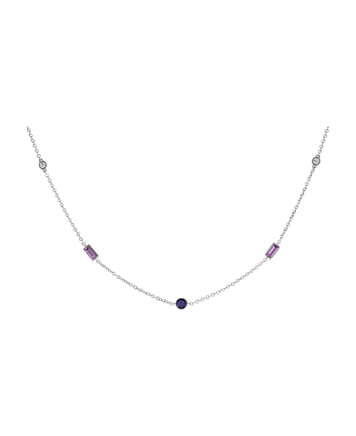 Round blue Sapphire, straight baguette pink Sapphire and round diamonds station necklace in bezel set