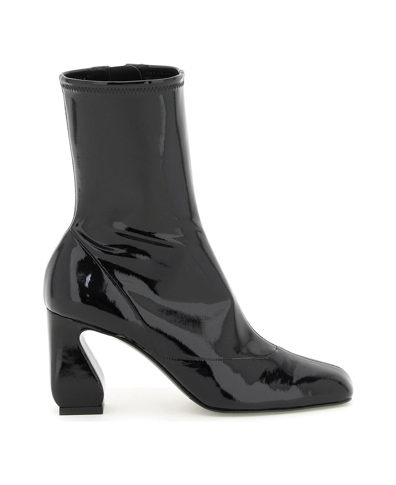 Patent leather ankle boots by SI ROSSI with side zippered closure, squared toe and iconic sculpted heel. Unlined interior with leatehr isole and leather sole with rubber insets.