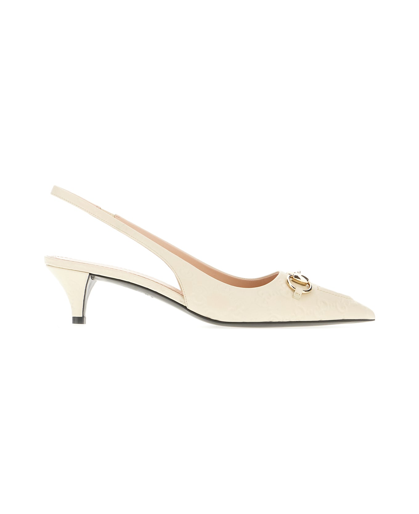 Slingback realized in calf leather characterized by embossed GG logo on the entire surface enriched by metal Horsebit detail on the toe. -Pointed toe -Stiletto heel -Printed logo on the inside