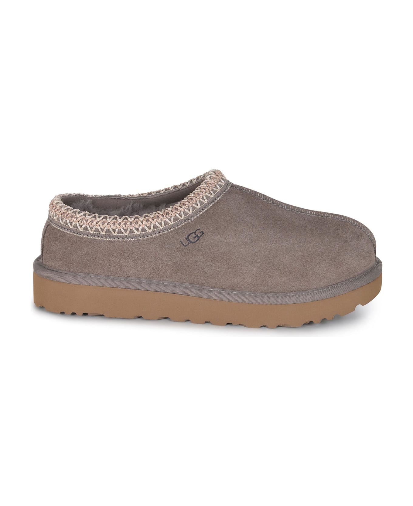 UGG "Tasman" mules made of camel-colored suede. Embroidered "Tasmain braid" detail on the collar. Contrasting embossed 'UGG' logo lettering. Lined in sheepskin. Wool insole. EVA rubber sole. Sole 100% Rubber 100% Leather