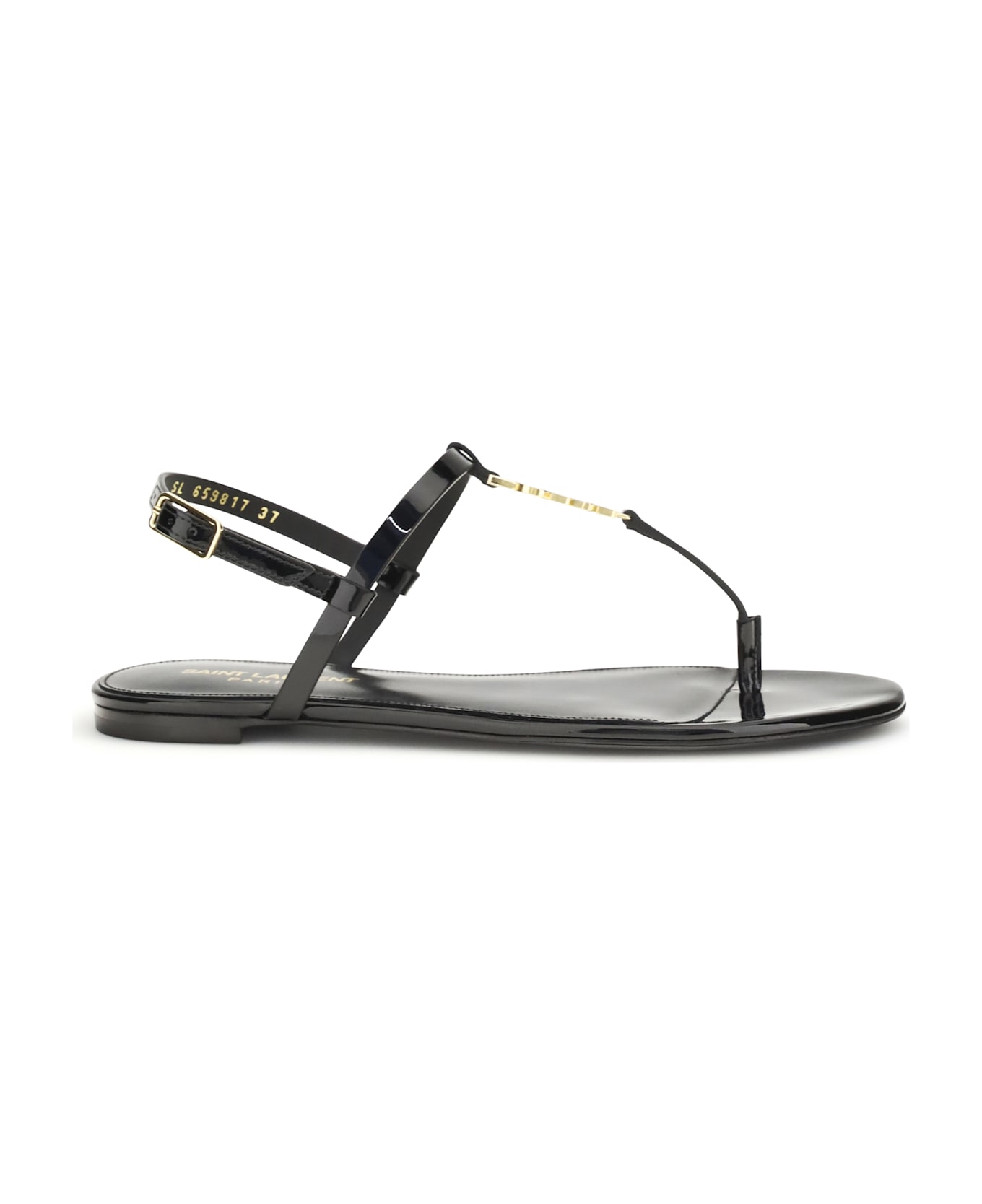 The cassandra patent leather sandals by saint laurent feature a flat design with a t-strap and an adjustable ankle buckle. adorned on the front with the ysl monogram in gold metal, they combine elegance and comfort, making them perfect for stylishly completing sophisticated and contemporary looks.