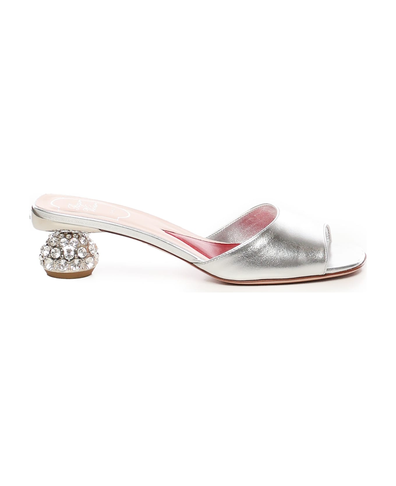 -Made of fine metallic leather -Boule heel embellished with crystals -Leather insole with heart-shaped insert -Leather sole -45mm heel -Made in Italy -Color: Silver