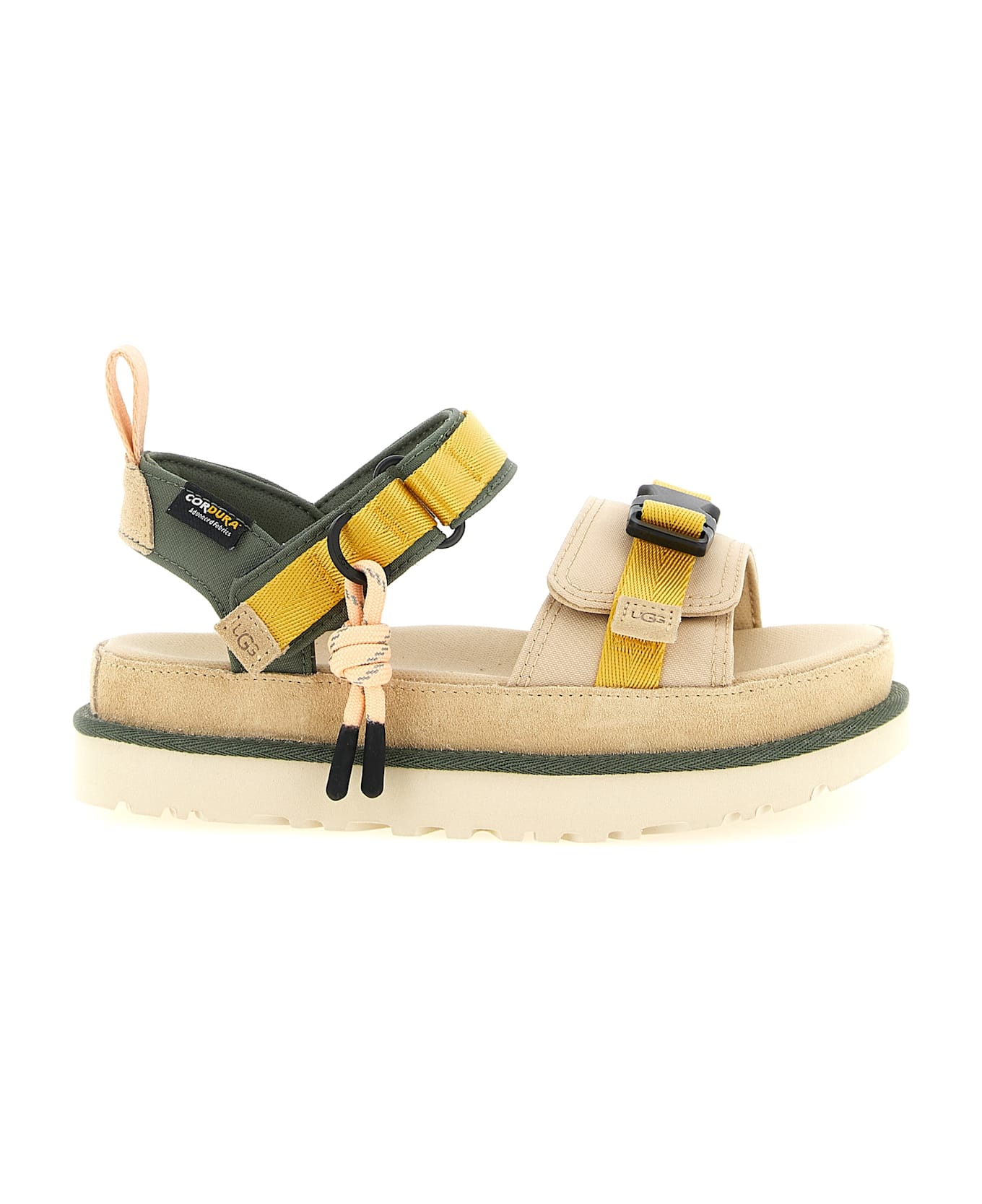 'Goldenstar Wildwood' suede and CORDURA® UltraLite fabric sandals, fabric lining, insole with peppermint anti-odour treatment, adjustable straps with velcro, metal buckle and decorative tassel tassel, shock-absorbing shaped inner sole, lightweight EVA sugar cane sole. SUSTAINABLE: Product made with recycled materials. SUSTAINABLE: The product was made at a facility that supports women in the brand's production and distribution process with the help of the Reimagining Industry to Support Equality (RISE) initiative.