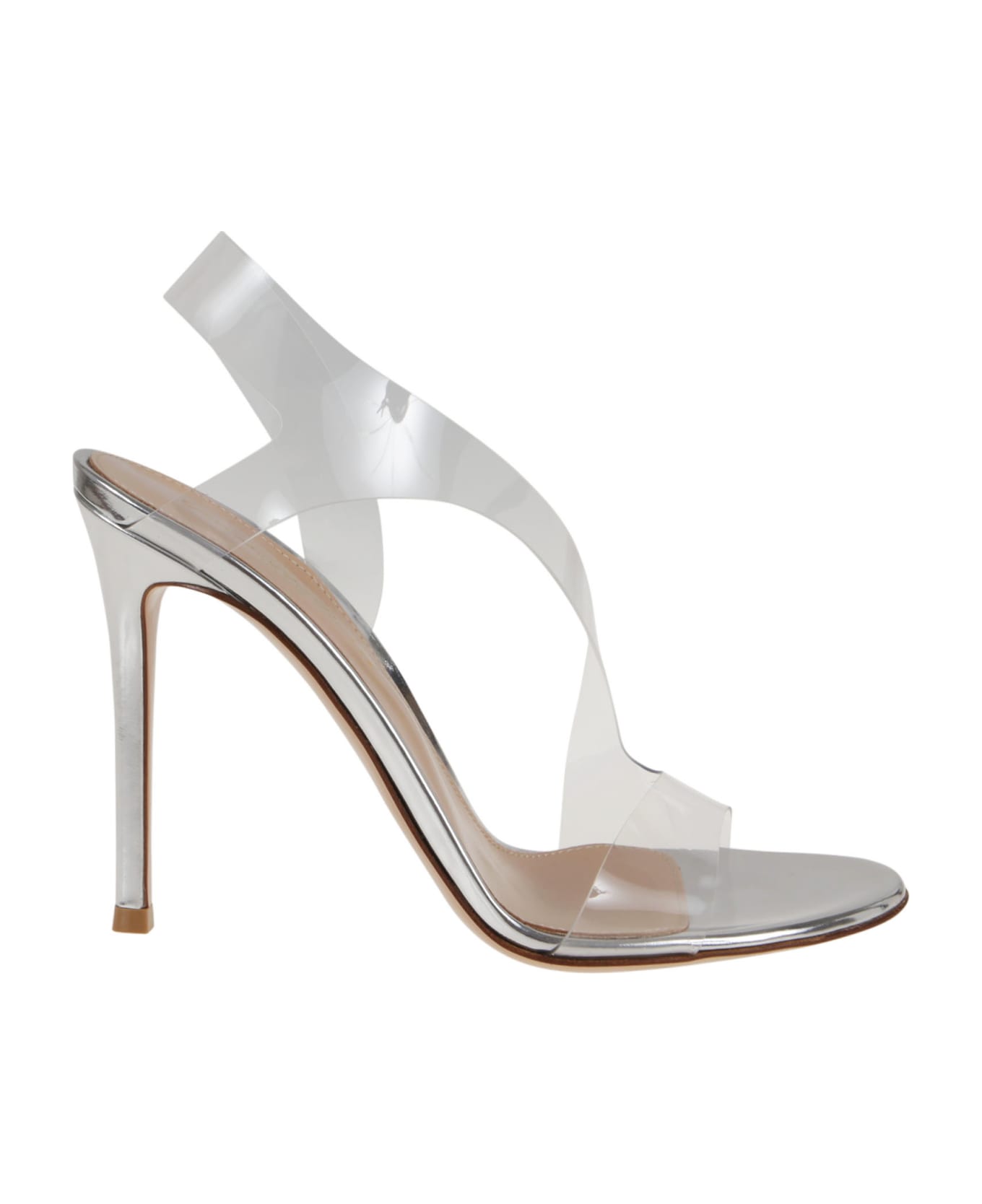 featuring silvercalf leather, transparent design, open toe, metallic effect, high stiletto heel and slingback strap.