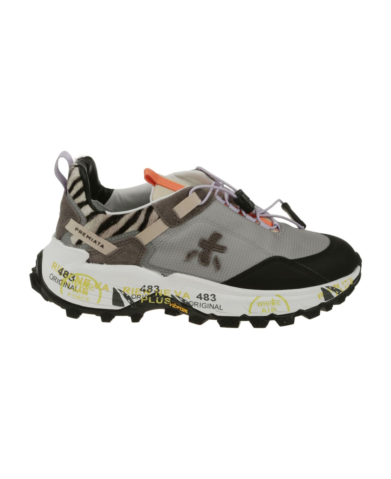 Premiata grey sneakers in nylon and breathable technical fabric, logo detail, animal print inserts, tongue on the back, sole with rubber designs.