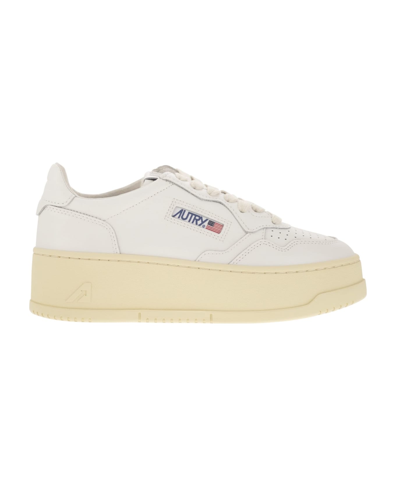 A new interpretation of the iconic Autry Medalist, elevated by a platform sole that gives an extra boost to the look. A perfect synthesis of 80s tennis inspiration and contemporary attitude, it stands out for its unexpected volumes and bright hues. This women's sneaker confirms all the characteristic details of the model: the colour block upper in soft leather, the micro-holes on the toe for greater breathability and the Autry logo. The chunky rubber sole slims the silhouette and supports movements with confidence. - Leather upper. - Toe with microholes - Flat cotton laces - Label with embroidery stitched on tongue - Padded collar - Leather and cotton terry lining - 2 cm raised leather insole - Rubber platform sole - Personalised fabric pouch DESIGNER ID: PTLWLL15