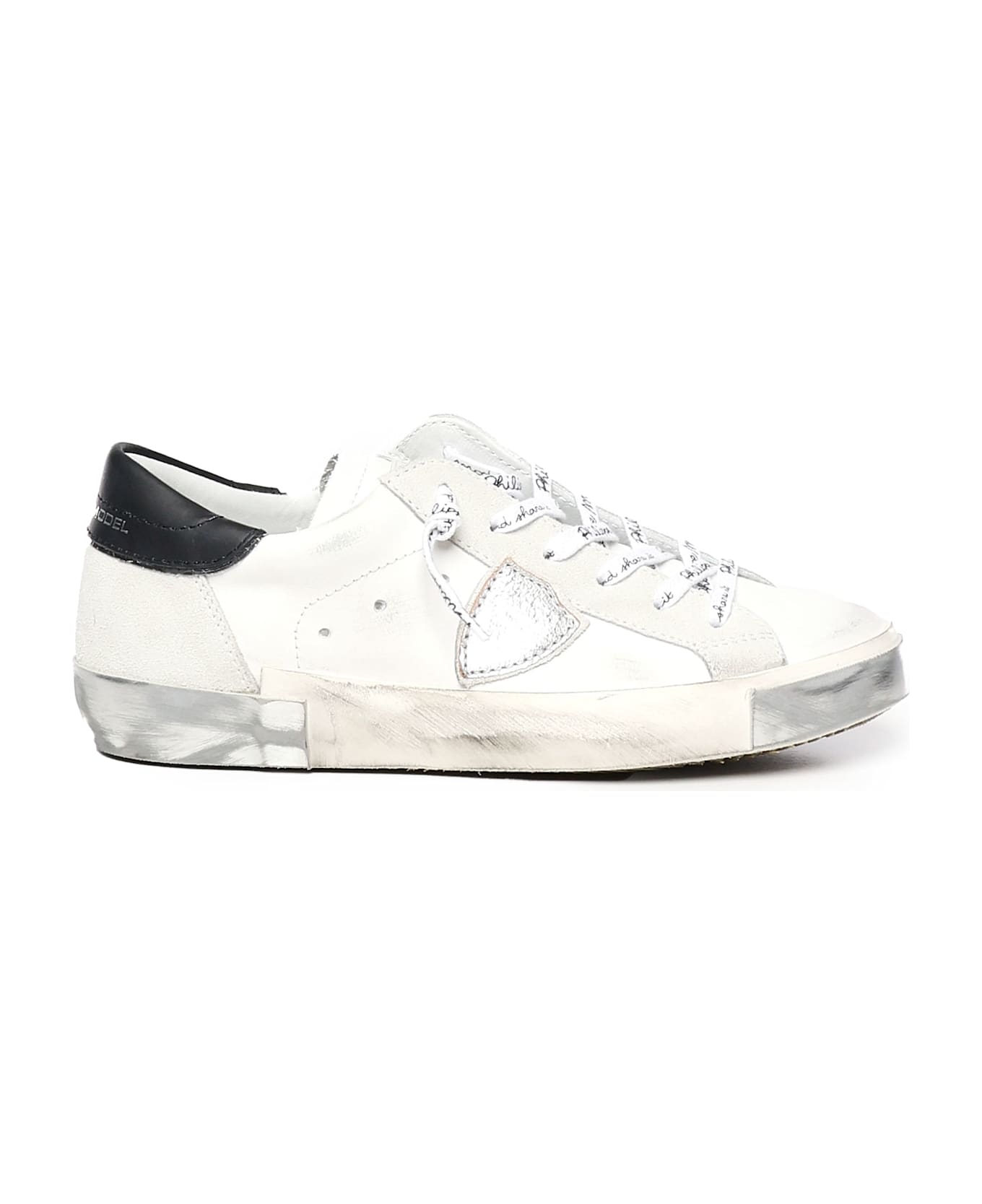 -Low sneaker with calfskin and suede upper -Metalized side badge -Leather and cotton terry lining -Rubber bottom with vintage-effect handcrafted banding and silver details -Color: White, Silver