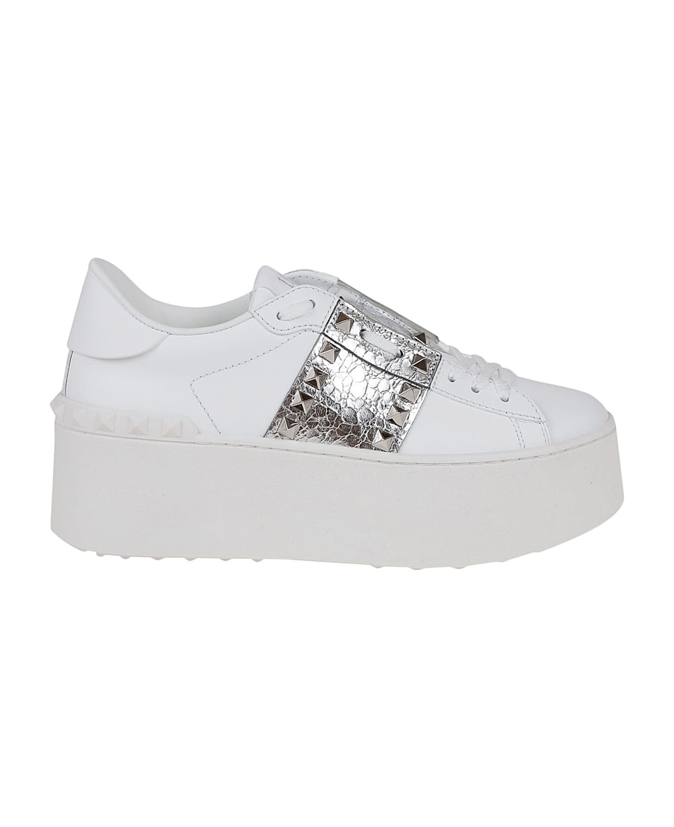 Flatform Rockstud Untitled sneaker in calfskin BY VALENTINO GARAVANI. Crackle-effect laminated nappa band with tone-on-tone stud applications; special label with number 11. Flatform rubber sole detail with rubber studs on the back.