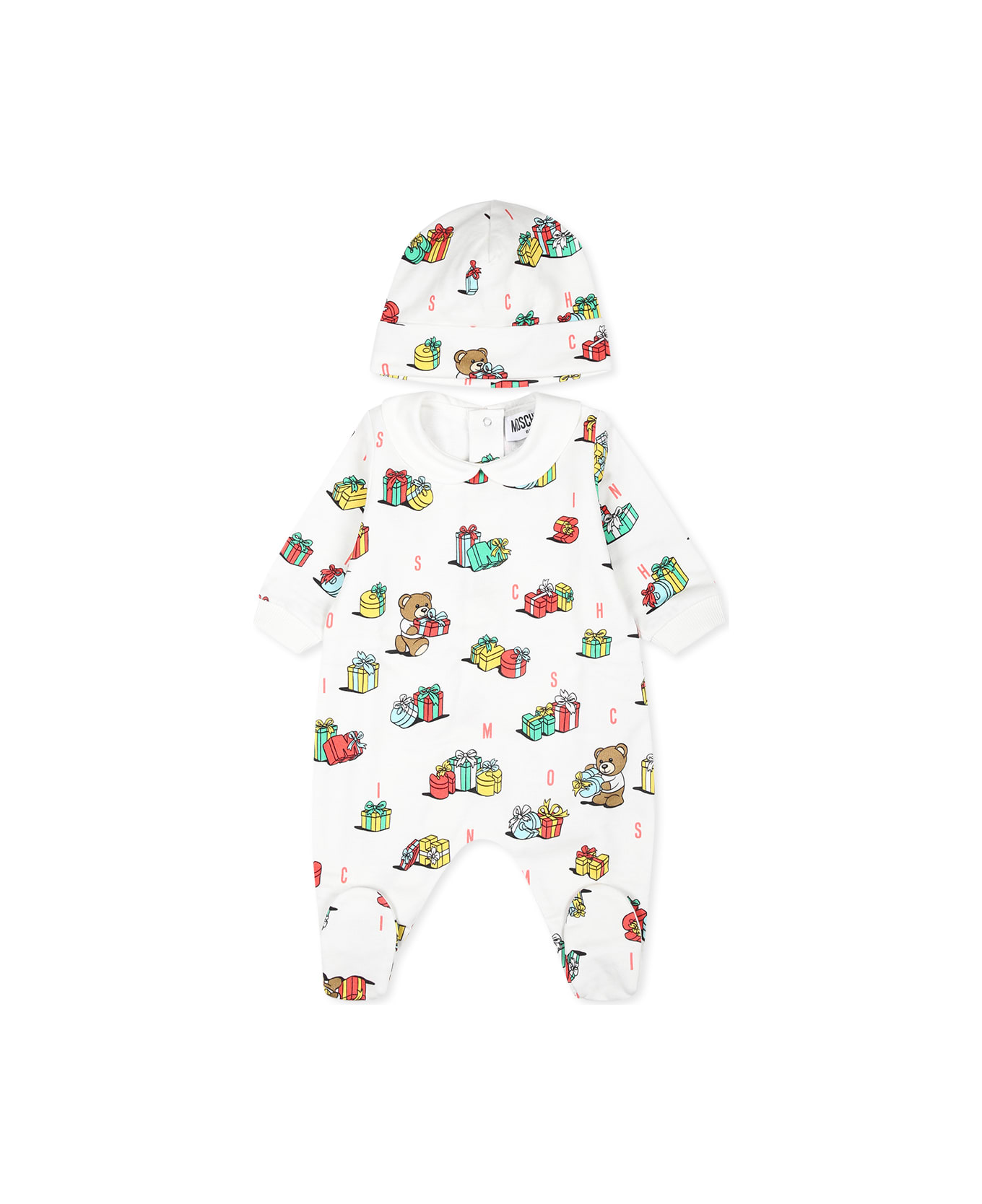 Ivory babygrow set from the Moschino Kids brand, consisting of onesie and hat. Fleece cotton babygrow, long sleeves, with peter pan collar, feet, snap button closure on the back and ribbed cuffs. It is embellished with Teddy Bear print, gifts and all-over logo. Cuffed hat, embellished with Teddy Bear print, gifts and all-over logo