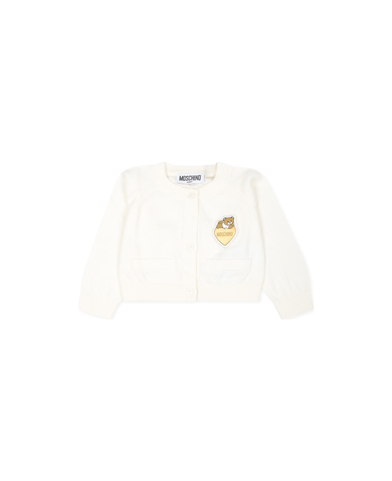 Ivory cardigan made of cotton and wool, with long sleeves, crew neck, ribbed hem and cuffs, button closure and pockets on the front. It is embellished with bear logo patch and golden heart on the chest.