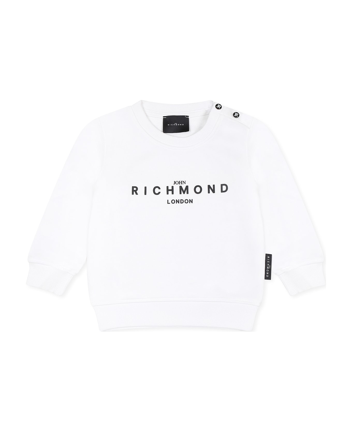 White sweatshirt in brushed cotton blend, long sleeves, with ribbed crew neck and snap button closure on the shoulder. It is embellished with black logo on the front and back, with logoed patch on one side.