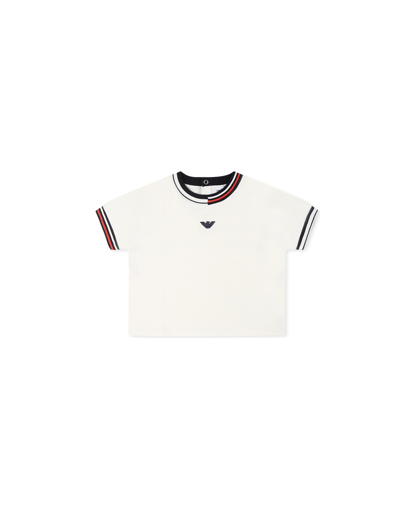 Beige t-shirt in heavy cotton jersey, short sleeves, with crew neck and ribbed sleeves with blue and red striped details and press stud fastening on the back. It is embellished with iconic blue eagle embroidered on the front.