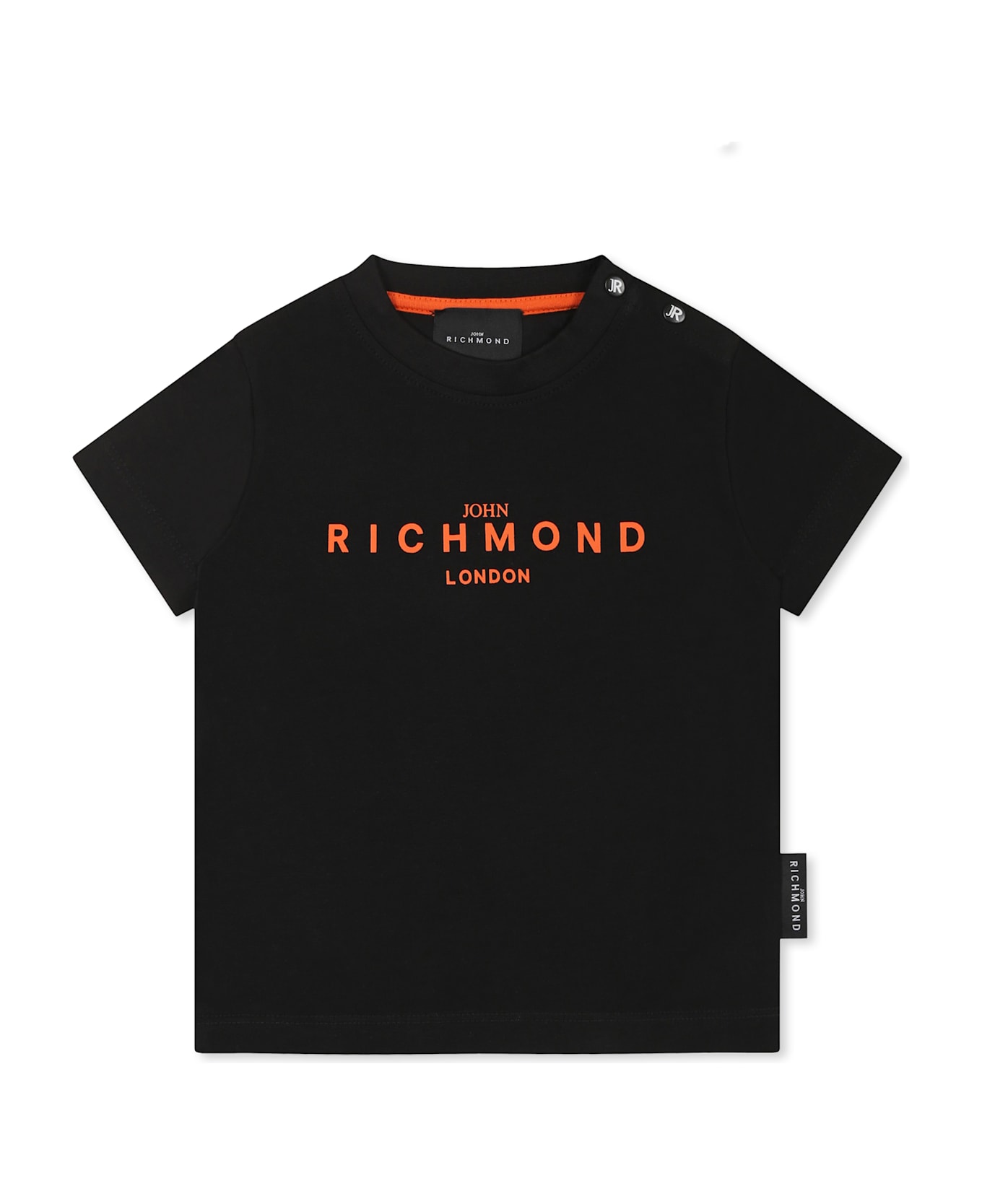 Black cotton t-shirt, short sleeves, with ribbed crew neck and snap button closure on the shoulder. It is embellished with orange logo on the front and back, with logoed patch on one side.