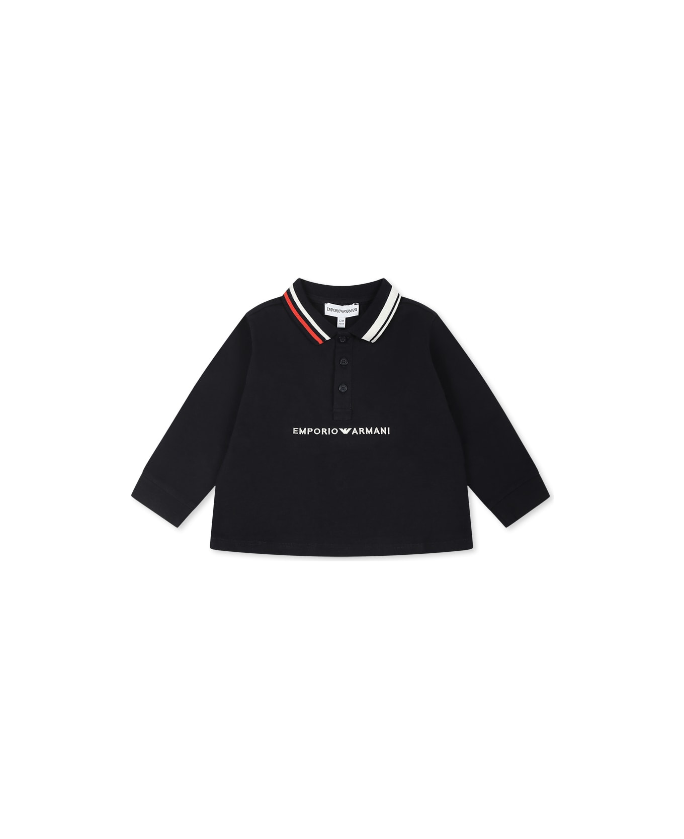 Blue cotton polo shirt, long sleeves, knitted collar with red and white details, front button fastening and ribbed cuffs. It is embellished with logo and iconic eagle embroidered on the front.