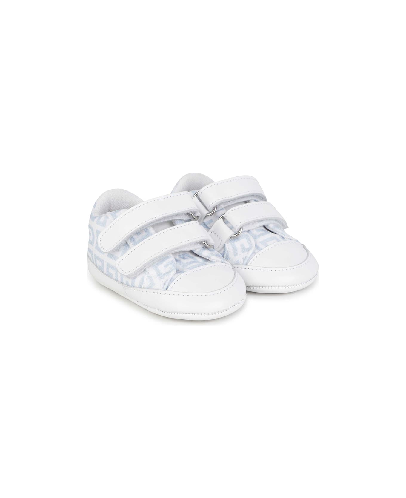 GIVENCHY Kids sneakers made of white jacquard canvas with light blue 4G pattern, white leather insert on the front and GIVENCHY label on the heel. Closure with two pull-on straps. The item is sold in a GIVENCHY box.