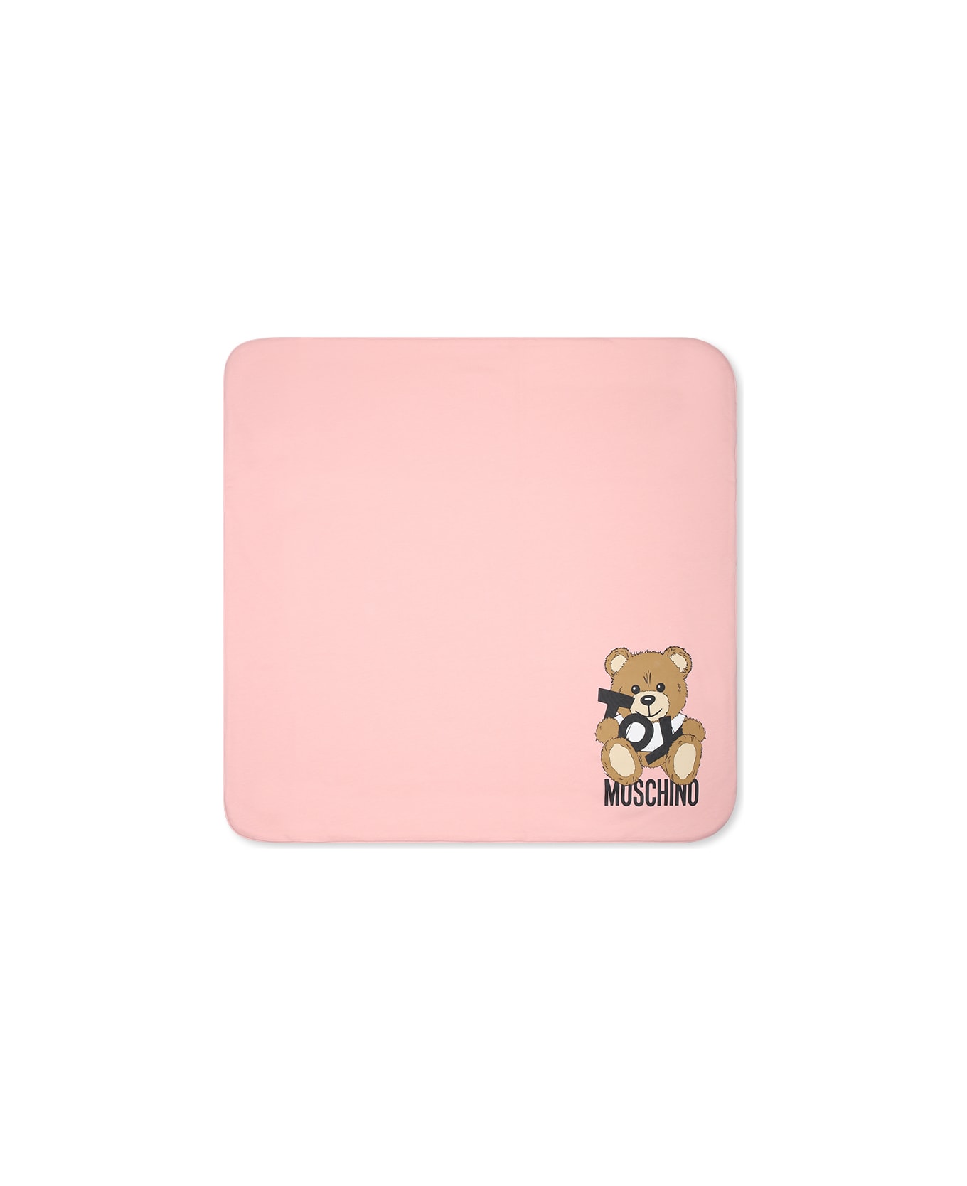 Pink blanket from the Moschino kids brand, in cotton; embellished with Teddy Bear and logo on one side.