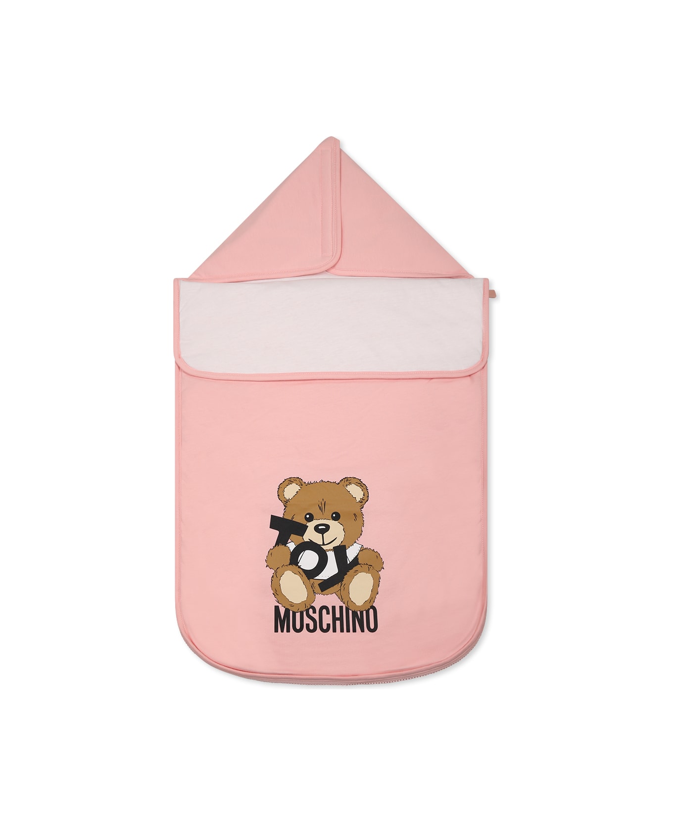 Pink sleeping bag from the Moschino Kids brand, in cotton, slightly padded, with side zip closure. It is embellished with Teddy Bear and logo on the front.