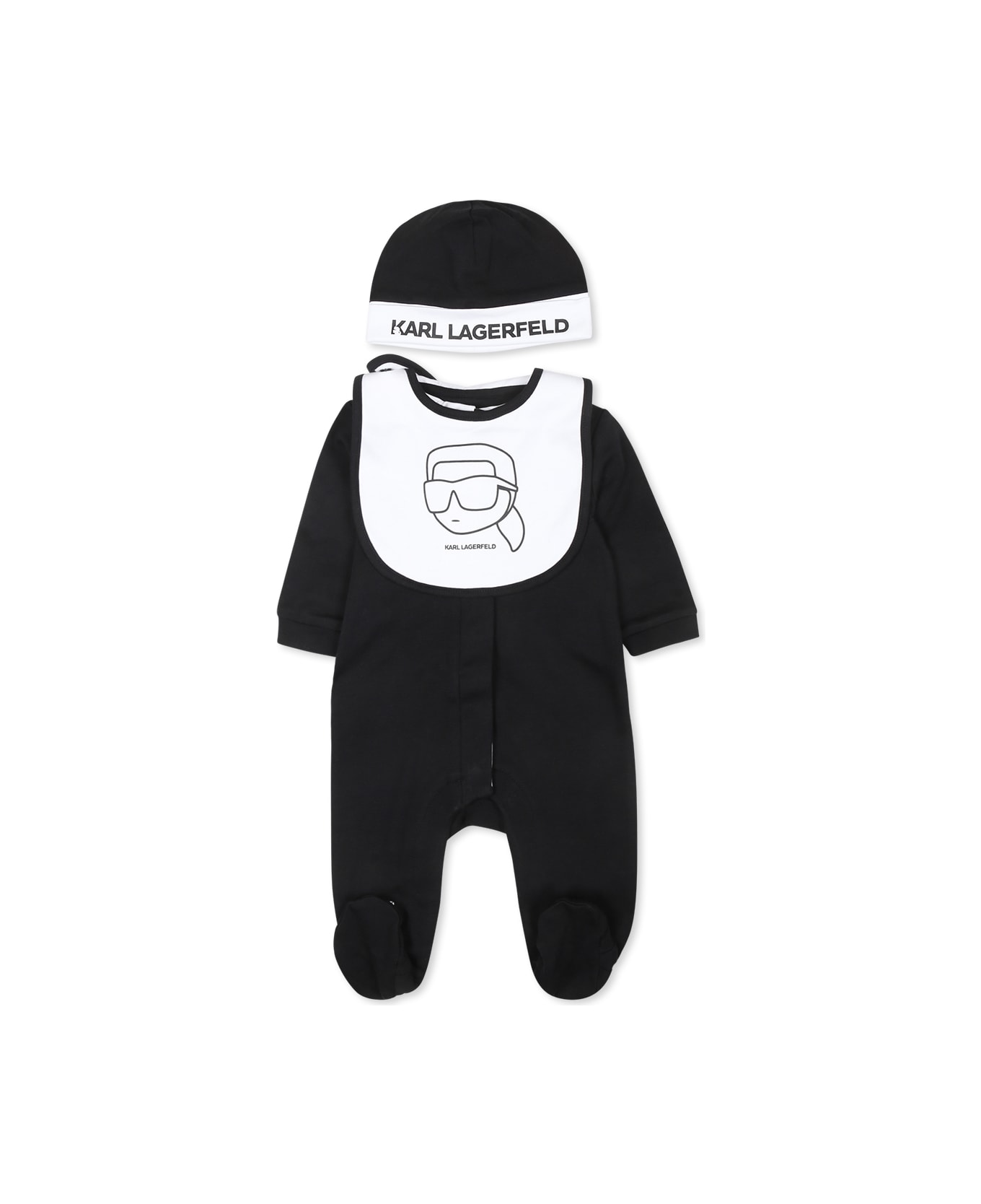 Organic cotton black babygrow set, composed of babygrow, bib and hat. Long sleeve romper, with white pointed collar, front snap button closure and feet. It is embellished with a Karl print on the chest. White bib with snap button closure on the back. It is embellished with a Karl print on the front. Black hat with contrasting cuff, embellished with a front logo.