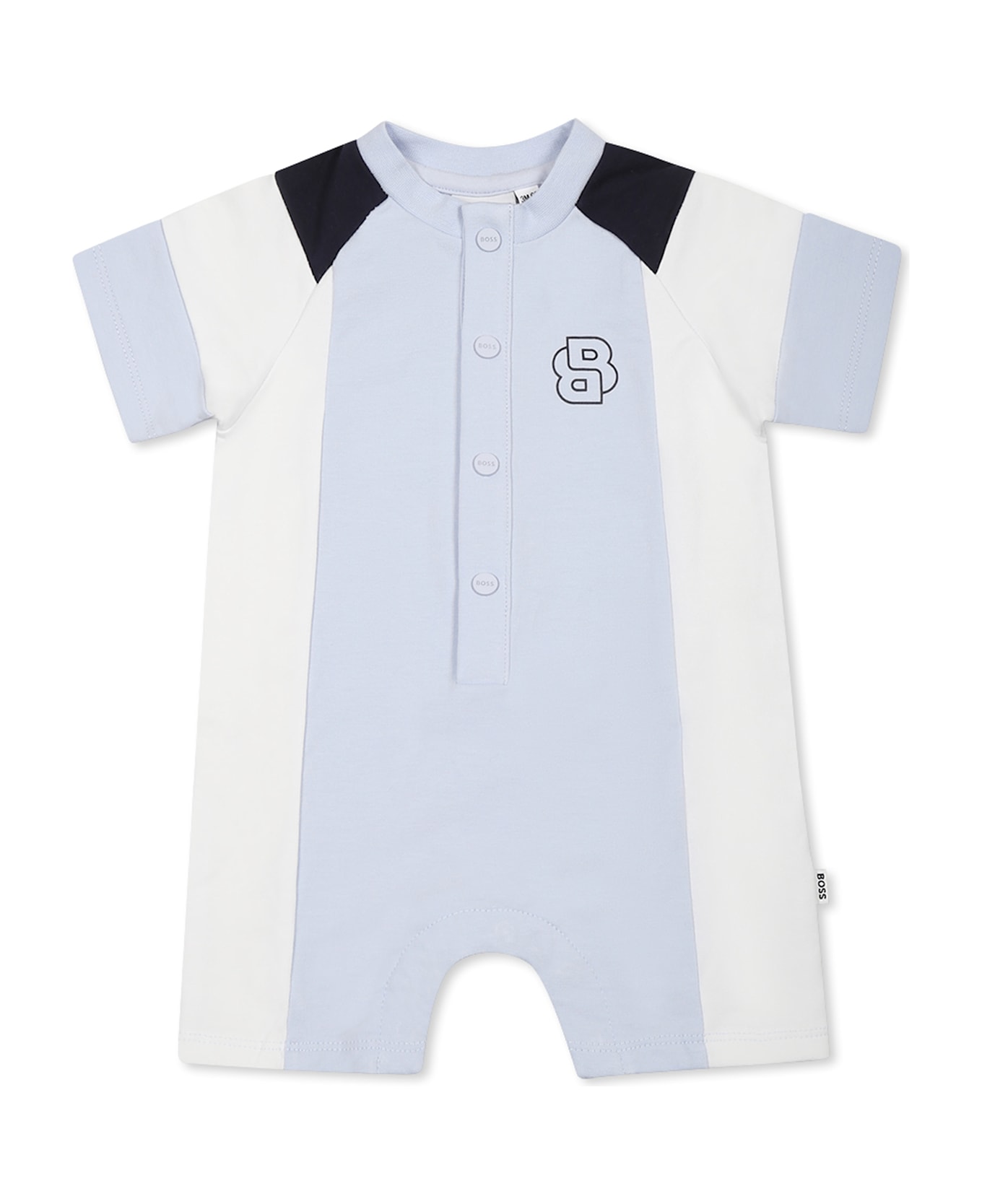 Light blue romper in cotton blend, short sleeves, ribbed crew neck, blue details on the shoulders, white side stripes, snap button fastening on the front and between the legs. It is embellished with BB logo on the chest.
